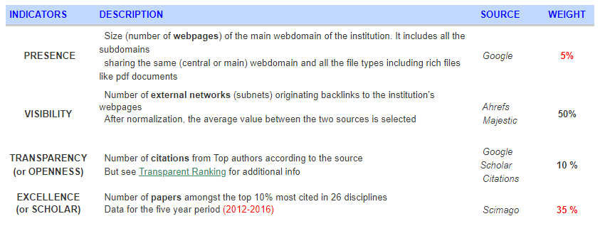 Tiêu chí và trọng số của Webometrics tháng 1/2019