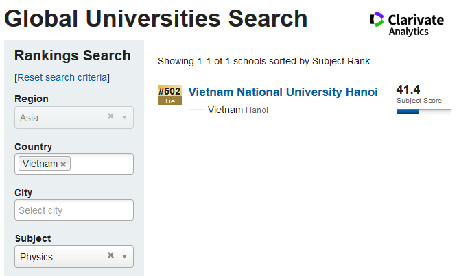 Theo Bảng xếp hạng các trường đại học tốt nhất toàn cầu (Best Global Universities Rankings) lần thứ 5 năm 2018 do báo Tin tức Hoa Kỳ (US News) bình chọn, ĐHQGHN là cơ sở giáo dục đại học duy nhất của Việt Nam có lĩnh vực Vật lý được xếp hạng, đứng thứ 502 toàn cầu. Kết quả xếp hạng lĩnh vực Vật lý của Việt Nam theo các tiêu chí trên như sau: uy tín nghiên cứu Vật lý khu vực (Physics regional research reputation) có thứ hạng 62, tỷ lệ công bố Vật lý từ hợp tác nghiên cứu (Physics percentage of total publications with international collaboration) có thứ hạng 83, các tiêu chí khác được xếp từ vị trí 252-696, trong đó uy tín nghiên cứu Vật lý toàn cầu có thứ hạng 472.