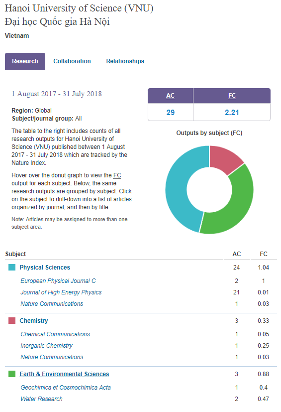 Trong bảng xếp hạng Nature Index, Trường ĐH Khoa học Tự nhiên, thành viên thuộc ĐHQGHN được xếp vị trí thứ hai trong top 10 cơ sở giáo dục đại học và nghiên cứu hàng đầu của Việt Nam (sau Viện Hàn lâm Khoa học và Công nghệ Việt Nam) và đứng đầu các cơ sở giáo dục đại học Việt Nam.