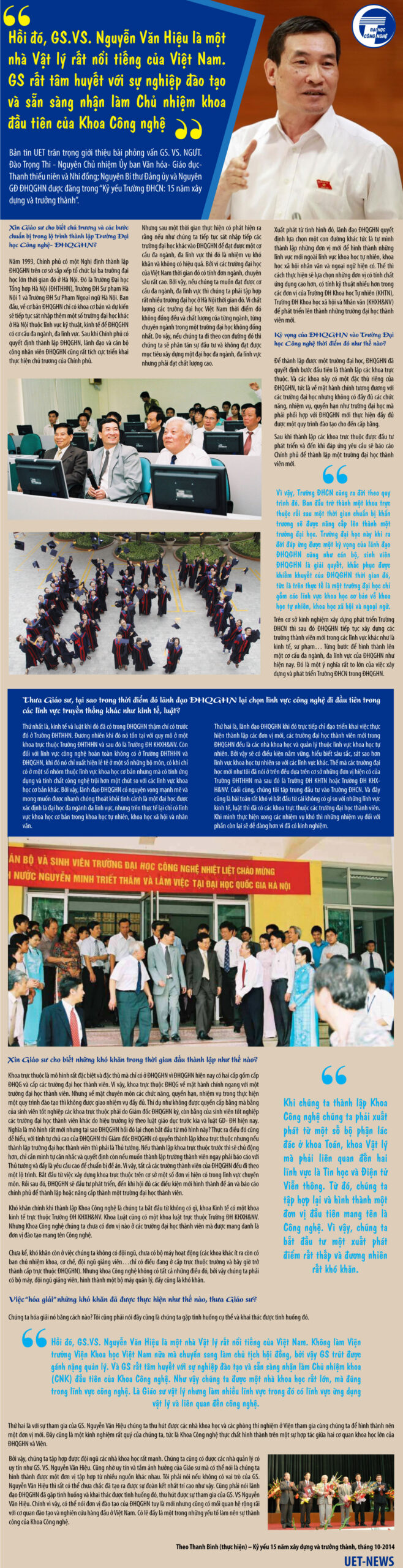 Bản tin UET giới thiệu bài phỏng vấn của GS.VS. Đào Trọng Thi – nguyên Giám đốc Đại học Quốc gia Hà Nội chia sẻ về quan điểm, định hướng và khó khăn trong những ngày đầu thành lập Khoa Công nghệ (nay là Trường Đại học Công nghệ), được đăng trong Kỷ yếu “15 năm xây dựng và trưởng thành”.
