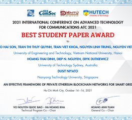 The report “An Effective Framework of Private Ethereum Blockchain Networks for Smart Grid” (in Vietnamese: “Mô hình mạng chuỗi khối Ethereum riêng tư và hiệu quả sử dụng cho lưới điện thông minh”) includes the authors of the Advanced Institute of Engineering and Technology (AVITECH) (University of Engineering and Technology – Vietnam National University) and won the Best Student Paper award at the International Conference on Advanced Technology in Communication 2021.