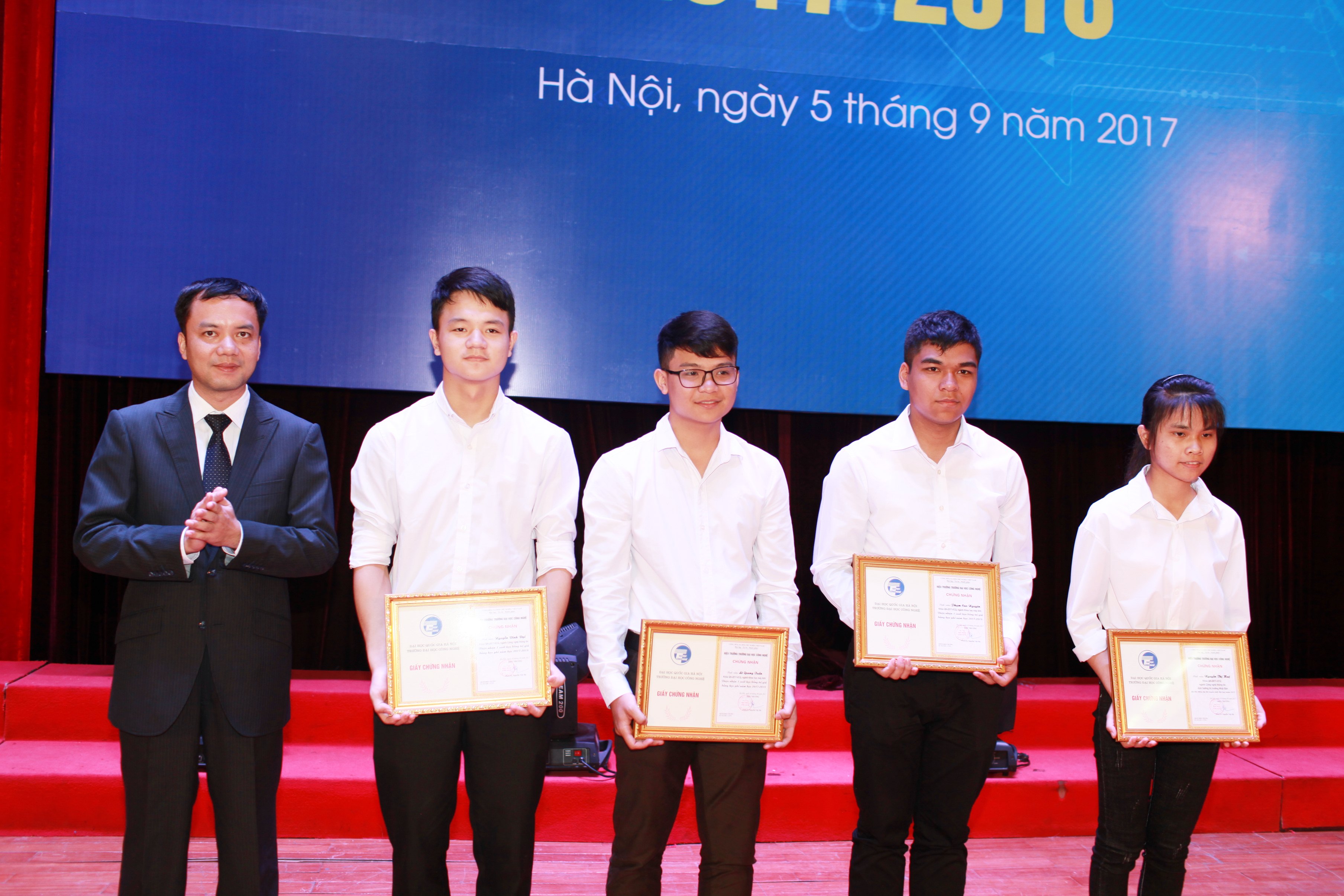 Tại Lễ khai giảng, để biểu dương các thành tích học tập của cá nhân và tập thể, lãnh đạo Nhà trường đã cấp học bổng cho thủ khoa Nguyễn Thị Huệ (đạt 29,75 điểm, ngành Công nghệ thông tin) và tân sinh viên Phạm Cao Nguyên, Lê Quang Tuấn đạt giải kỳ thi Olympic Tin học quốc tế và Nguyễn Đình Đại đạt giải kỳ thi Olympic Tin học châu Á- Thái Bình Dương được tuyển thẳng vào Trường ĐHCN năm 2017. Đồng thời trao giấy khen và phần thưởng cho 07 sinh viên đạt giải Nhất nghiên cứu khoa học cấp Trường, 07 sinh viên đạt giải trong các kỳ thi Olympic; 11 sinh viên đại diện cho 86 cá nhân có thành tích học tập xuất sắc.