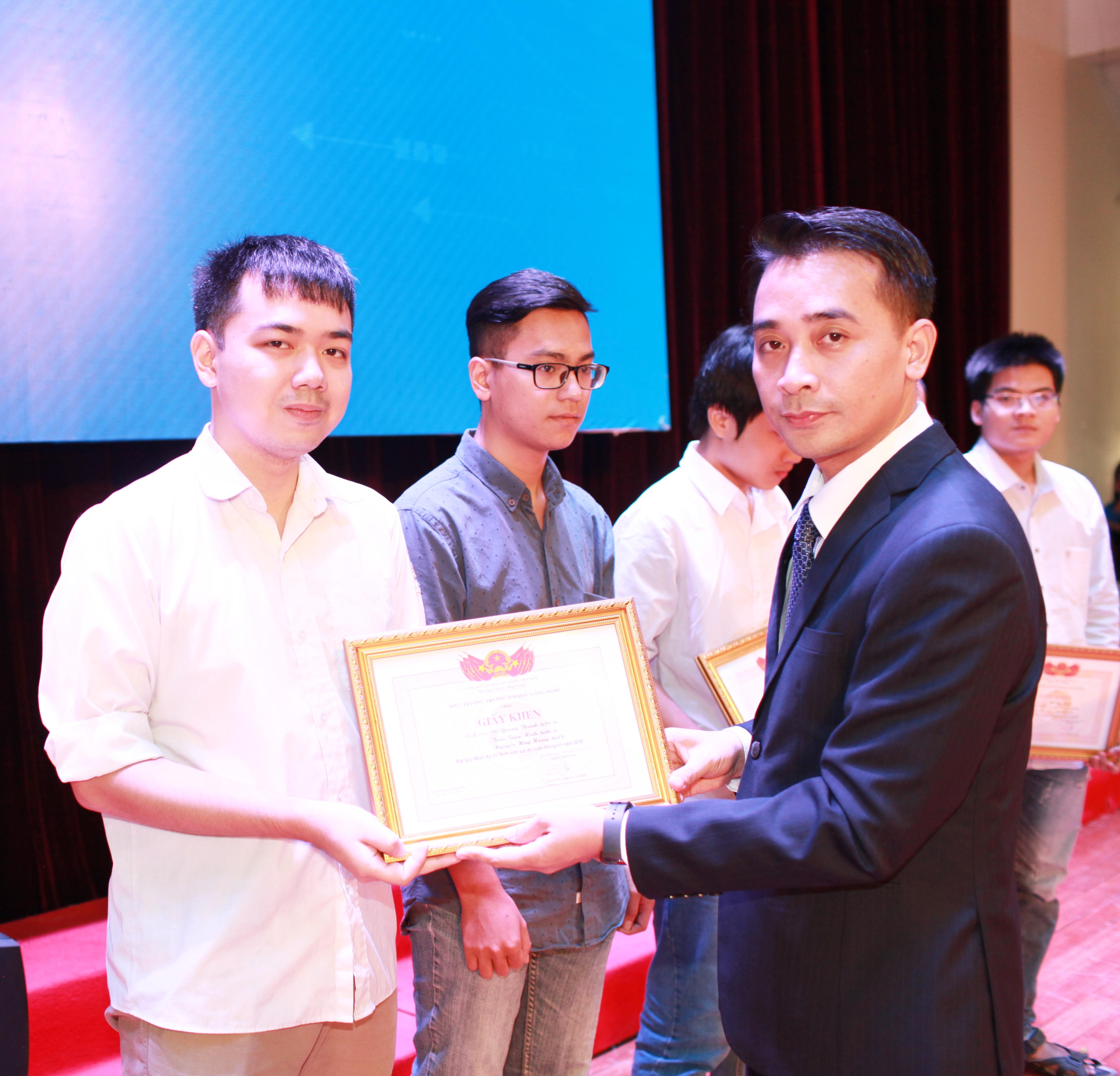 Phó Hiệu trưởng Chử Đức Trình (ngoài cùng bên phải ảnh) trao giấy khen cho các sinh viên đạt