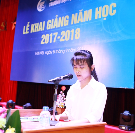 Thay mặt các tân sinh viên khóa mới, tân sinh viên Nguyễn Thị Huệ (K62, ngành Công nghệ thông tin) đã phát biểu cảm ơn các thầy cô và bày tỏ niềm xúc động, tự hào khi được trở thành sinh viên trường Đại học Công Nghệ, ĐHQGHN. Đồng thời, tân sinh viên cũng bày tỏ mong muốn rằng trong những năm học tới dưới mái trường ĐHCN sẽ nhận được sự quan tâm, giúp đỡ của Ban giám hiệu Nhà trường, các thầy cô giáo để sinh viên có điều kiện học tập, rèn luyện tốt nhất, hoàn thành tốt chương trình đào tạo và trở thành những công dân có ích cho xã hội.