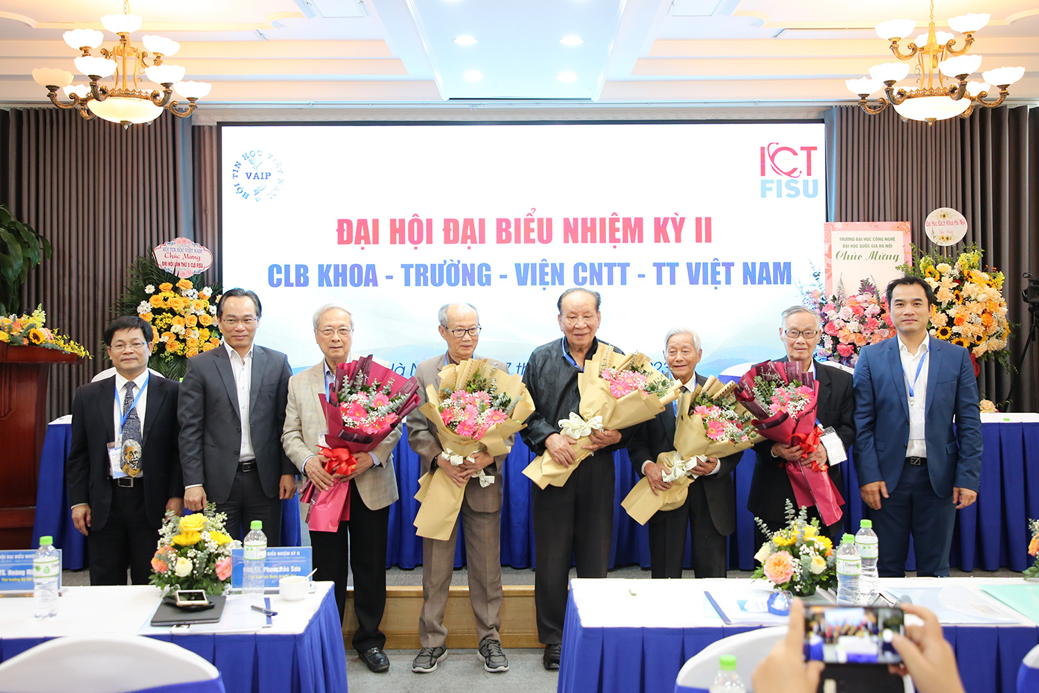 GS.TS. Nguyễn Thanh Thủy (ngoài cùng, bên trái) và PGS.TS. Phạm Bảo Sơn (ngoài cùng, bên phải) tri ân những hỗ trợ của các nhà lão thành trong lĩnh vực CNTT-TT Việt Nam