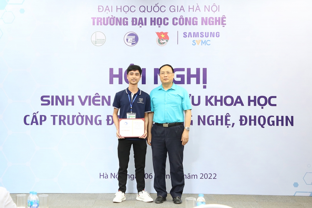 GS. TSKH Nguyễn Đình Đức trao giải Nhì tại Hội nghị Nghiên cứu Khoa học Sinh viên cho sinh viên Nguyễn Văn Đức