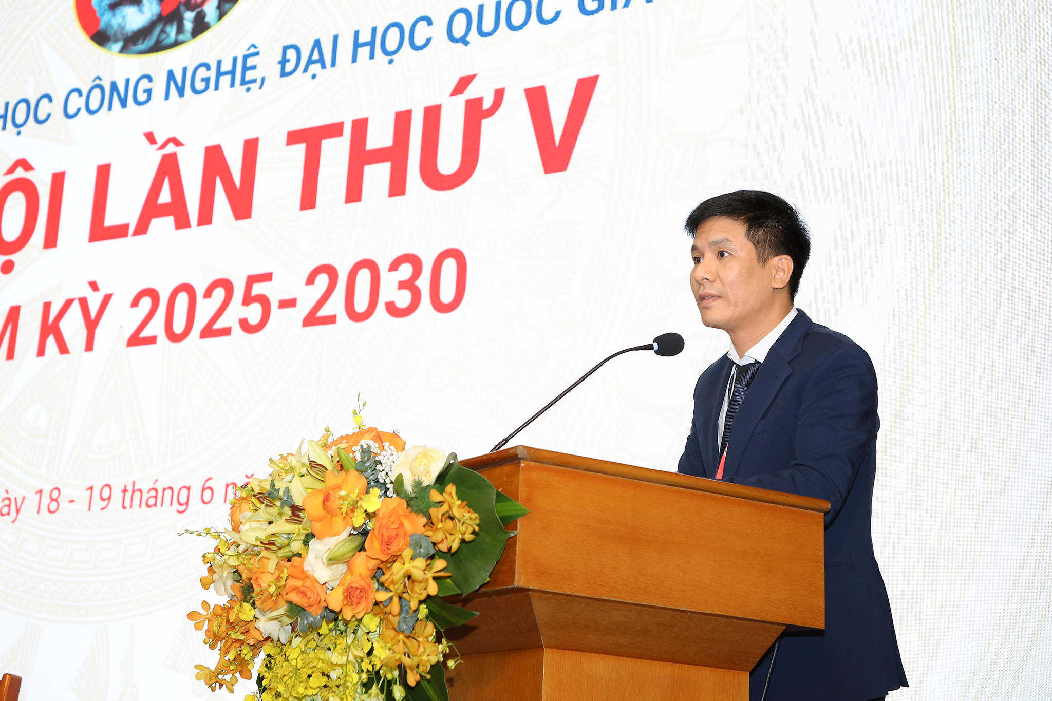 Thay mặt Đoàn Chủ tịch, GS.TS Chử Đức Trình – Phó Bí thư Đảng ủy, Hiệu trưởng Trường ĐH Công nghệ trình bày Báo cáo “Phát triển bền vững Trường ĐH Công nghệ theo định hướng trường đại học nghiên cứu và đổi mới sáng tạo”. Báo cáo nêu rõ những thành tích nổi bật khẳng định vai trò lãnh đạo toàn diện của Đảng bộ trong giai đoạn 2020-2025. Trong bối cảnh, Trường ĐH Công nghệ chuyển sang mô hình tự chủ tài chính, Đảng bộ đã thực hiện tốt công tác tổ chức bộ máy, kiện toàn Hội đồng trường, thành lập Viện Trí tuệ nhân tạo, Khoa Công nghệ Xây dựng – Giao thông và sắp xếp, tinh gọn tổ chức bộ máy từ 22 đơn vị cấp 2 còn 14 đơn vị cấp 2.