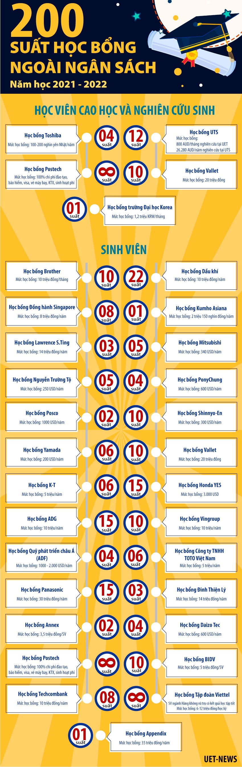 [Infographic] Đa dạng về học bổng dành cho sinh viên, học viên cao học và nghiên cứu sinh Trường Đại học Công nghệ