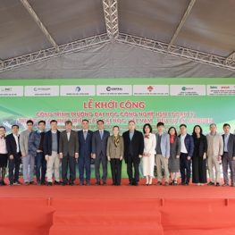 Đại diện lãnh đạo ĐHQGHN, Trường ĐH Công nghệ, Ngân hàng Thế giới, các nhà thầu tư vấn, thi công và lãnh đạo xã Thạch Hòa, huyện Thạch Thất chụp ảnh lưu niệm tại lễ khởi công