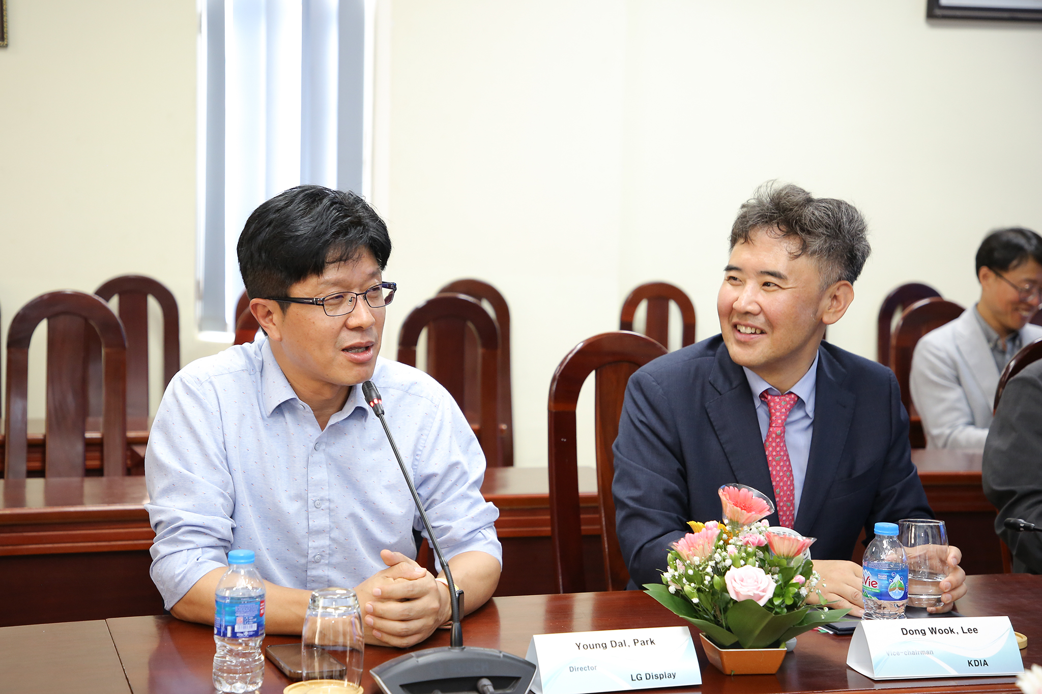 Về phía đoàn công tác có ông Lee Dong Wook – Phó Chủ tịch KDIA; ông Park Young Dal – Phó Tổng giám đốc Công ty LG Display Việt Nam Hải Phòng (LGDVH); ông Han Chul Jong – Giám đốc Trung tâm, Viện Công nghệ điện tử Hàn Quốc; ông Lee Chang Hoon – Giám đốc Trung tâm, Cơ quan Chứng nhận kiểm nghiệm Hàn Quóc cùng đại diện lãnh đạo các công ty SeoulViosys, Công ty TopEngineering.