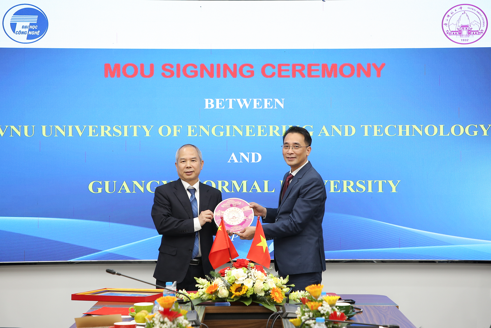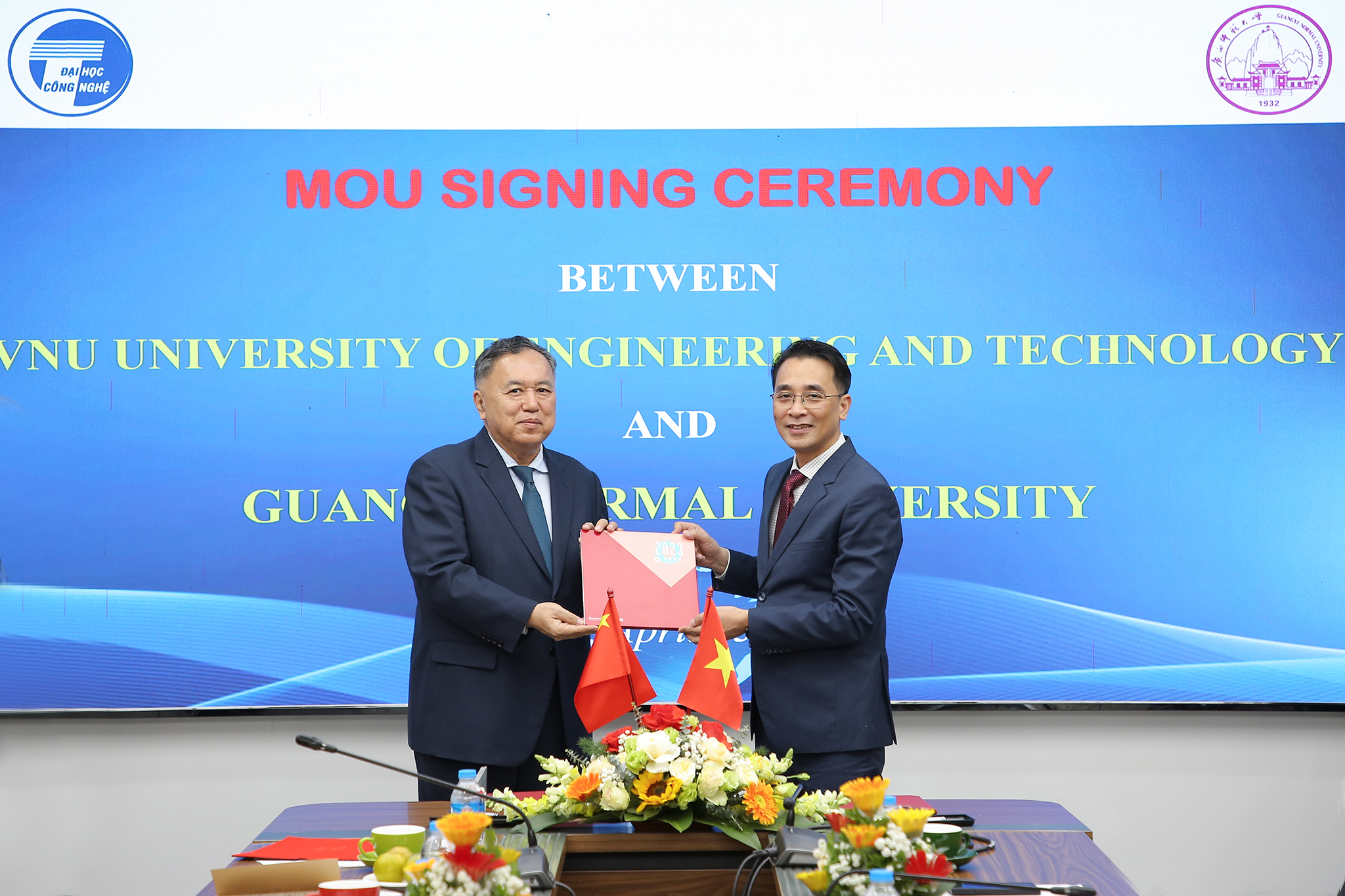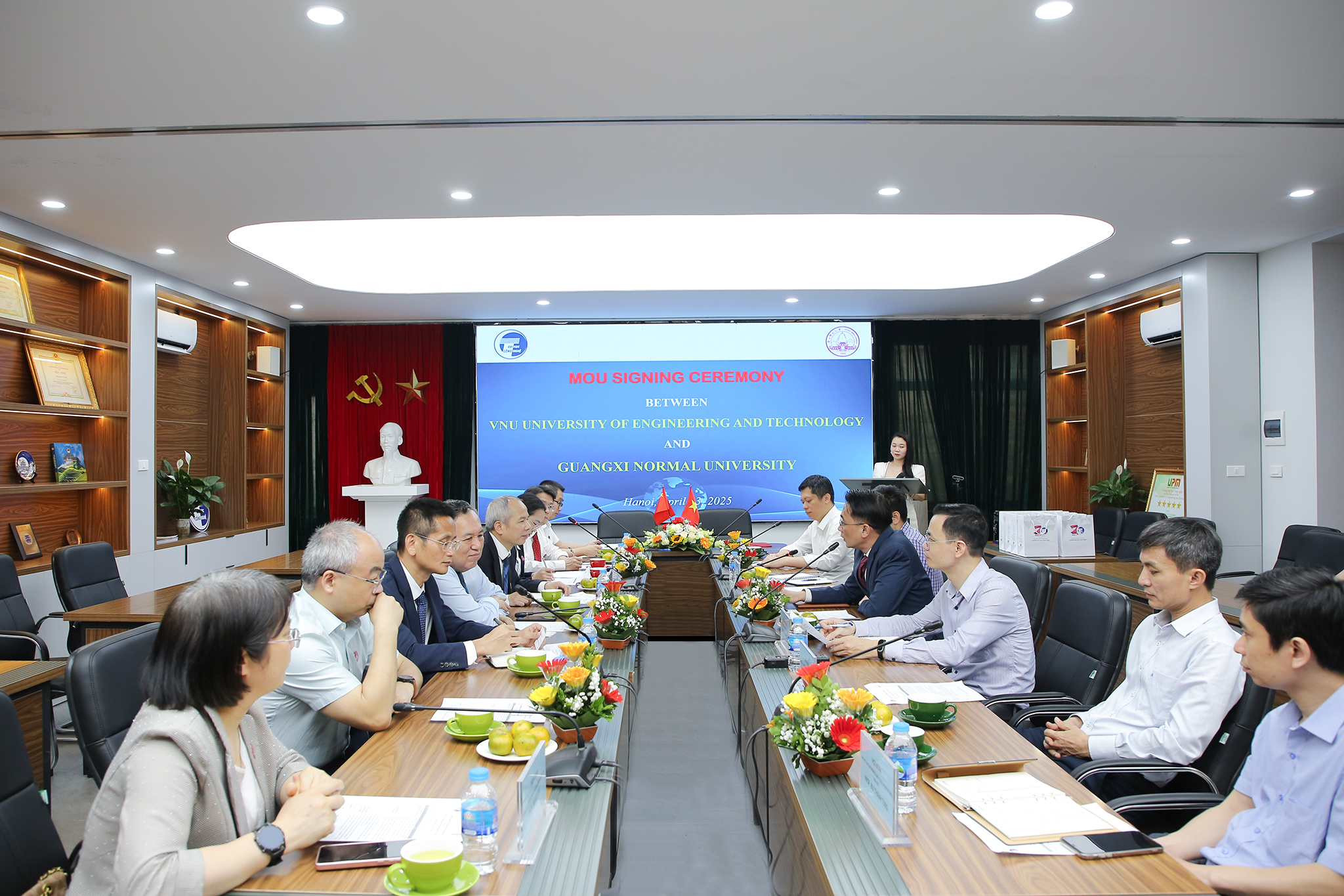 Ngày 23/4/2025, Trường Đại học Công nghệ – Đại học Quốc gia Hà Nội đã ký kết hợp tác trong lĩnh vực đào tạo, nghiên cứu khoa học với Trường Đại học Sư phạm Quảng Tây, Trung Quốc. Đoàn đại biểu do ông Zheng Dawei – Tham tán Giáo dục Đại sứ quán Trung Quốc tại Việt Nam, ông Wang Tingguan – Thư ký thứ nhất Đại sứ quán Trung Quốc tại Việt Nam và ông Lý Tiên Hiền – Phó Hiệu trưởng Trường Đại học Sư phạm Quảng Tây, Trung Quốc dẫn đầu.
