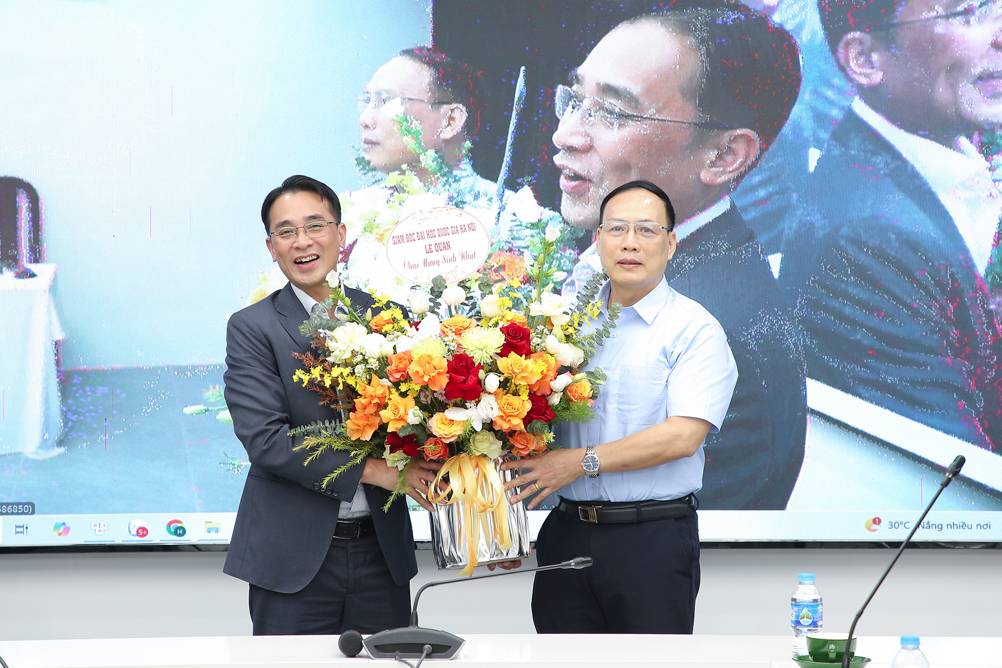 GS.TS Chử Đức Trình trao hoa chúc mừng GS.TSKH Nguyễn Đình Đức của Giám đốc ĐHQGHN