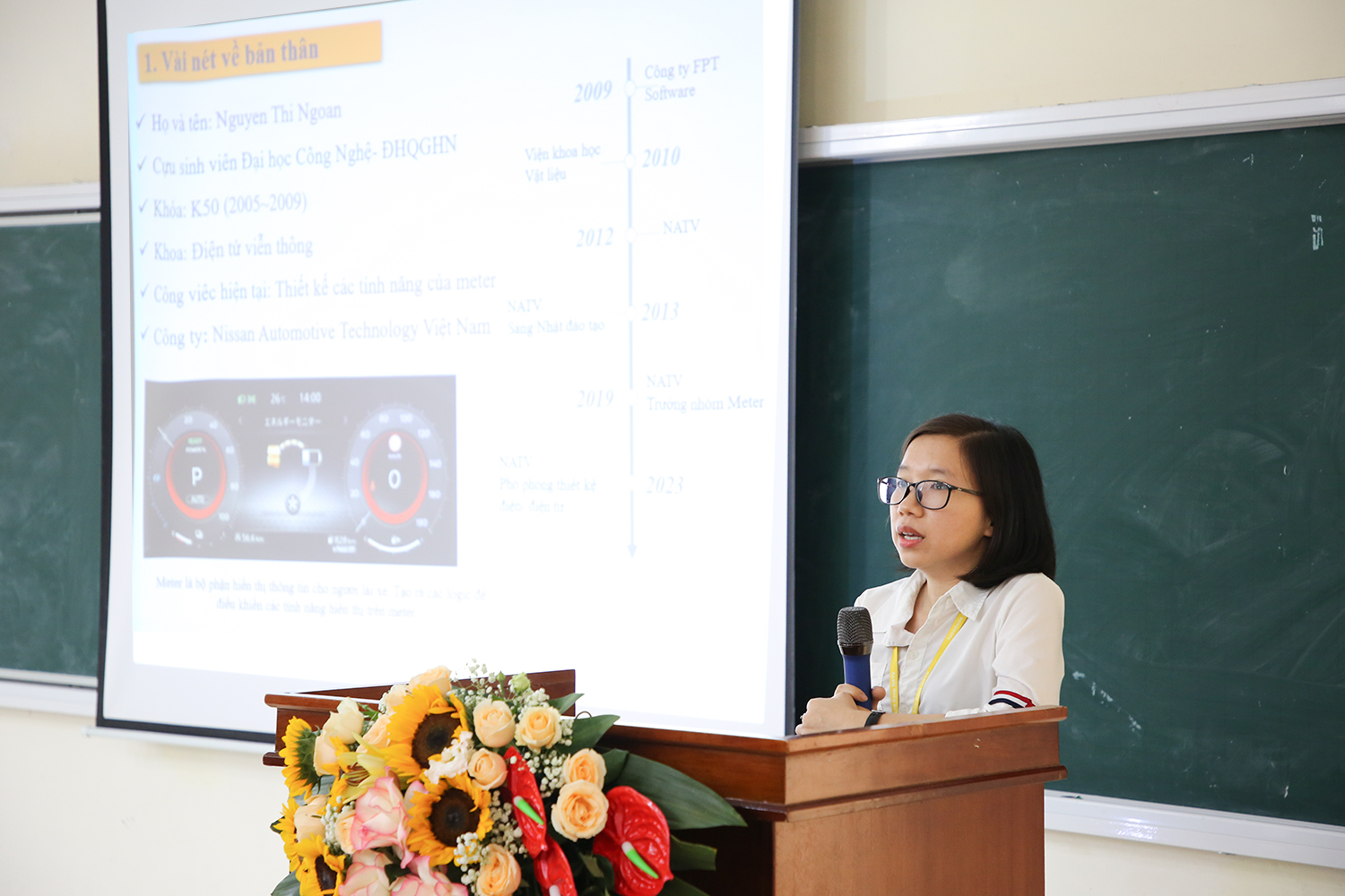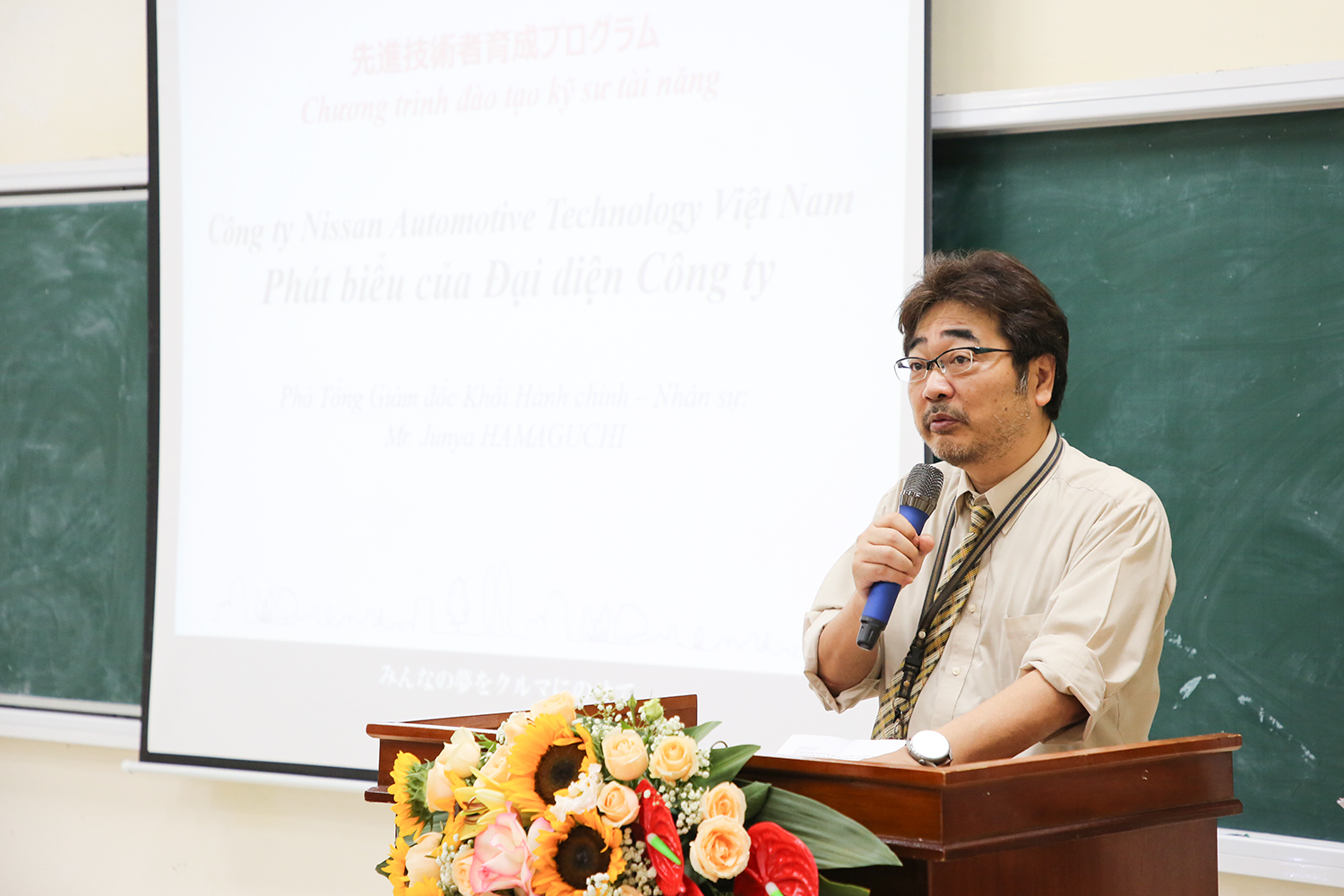Tiếp nối sự thành công trong 6 năm hợp tác với Trường ĐH Công nghệ, Công ty NATV tổ chức buổi hội thảo hấp dẫn về chương trình đào tạo tuyển dụng tới sinh viên năm cuối của Nhà trường. Ông Hamaguchi Junya – Phó Tổng giám đốc khẳng định: “Với sự phối hợp của Nhà trường, chương trình này rất bổ ích dành cho sinh viên tài năng. Cho đến nay, công ty có gần 300 cán bộ là cựu sinh viên của Trường đang công tác và cống hiến vào sự phát triển của công ty”. Bên cạnh đó, ông Hamaguchi Junya đánh giá cao những cựu sinh viên Trường ĐHCN hiện đang làm việc tại công ty. Họ đều làm việc với tinh thần hăng say, cầu tiến và đạt nhiều kết quả tốt. Phó Tổng giám đốc đã chia sẻ về lĩnh vực sản xuất ô tô của Tập đoàn Nissan nói chung và Công ty NATV nói riêng. Công ty NATV là công ty đang đảm nhận việc thiết kế hơn 65% dữ liệu CAD đối với xe Nissan trên toàn thế giới. Trong năm vừa qua, đã có trên 3.167.000 chiếc ô tô Nissan bán ra, chiếm 5% tổng lượng xe bán ra trên phạm vi toàn cầu. Vì vậy, sinh viên tốt nghiệp sau khi vào công ty sẽ đảm nhận những công việc liên quan đến thiết kế ô tô. Việc tự tay tạo ra những chiếc xe Nissan sẽ là động lực, niềm tự hào của bản thân.