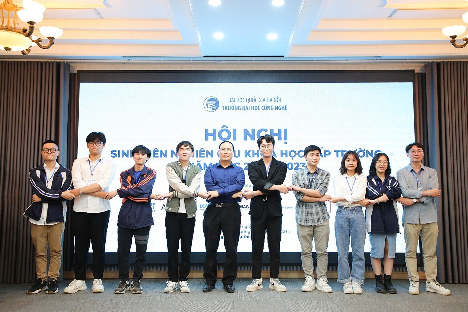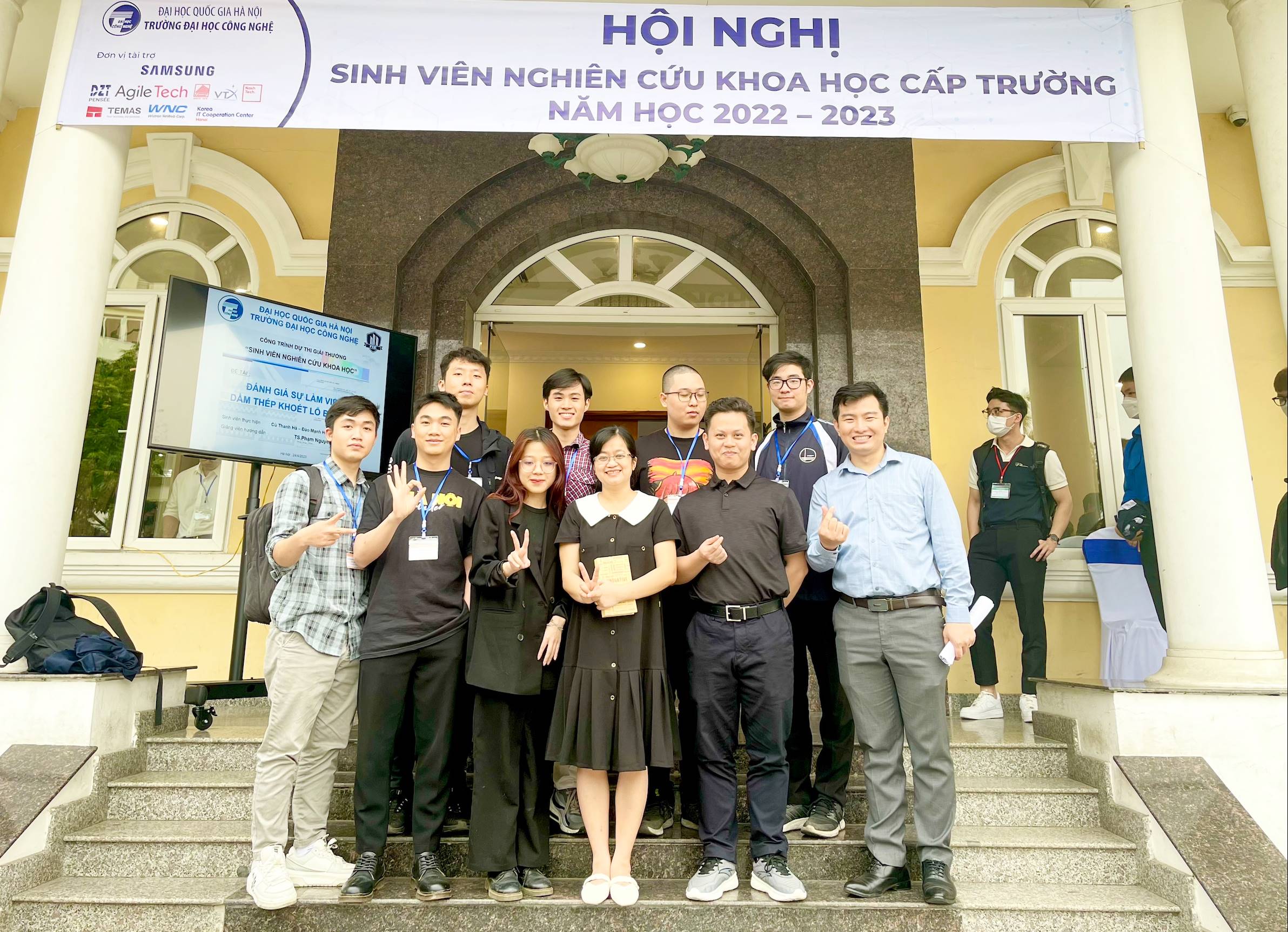 Cấn Quang Trường (thứ tư, bên phải ảnh) cùng các nhóm nghiên cứu đạt giải Nhất hội nghị sinh viên nghiên cứu khoa học cấp Trường năm học 2022-2023