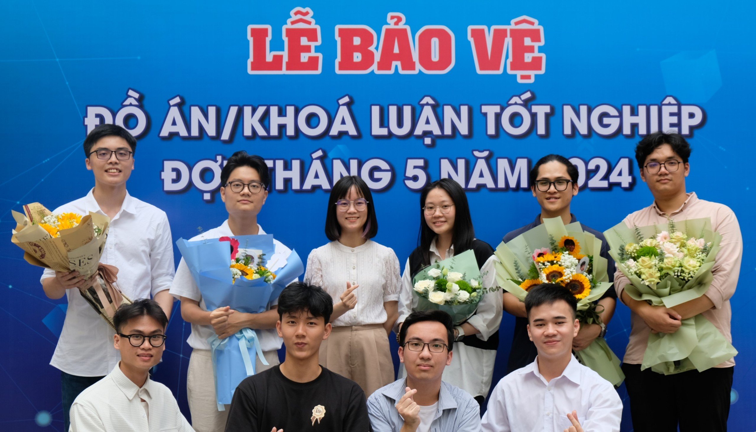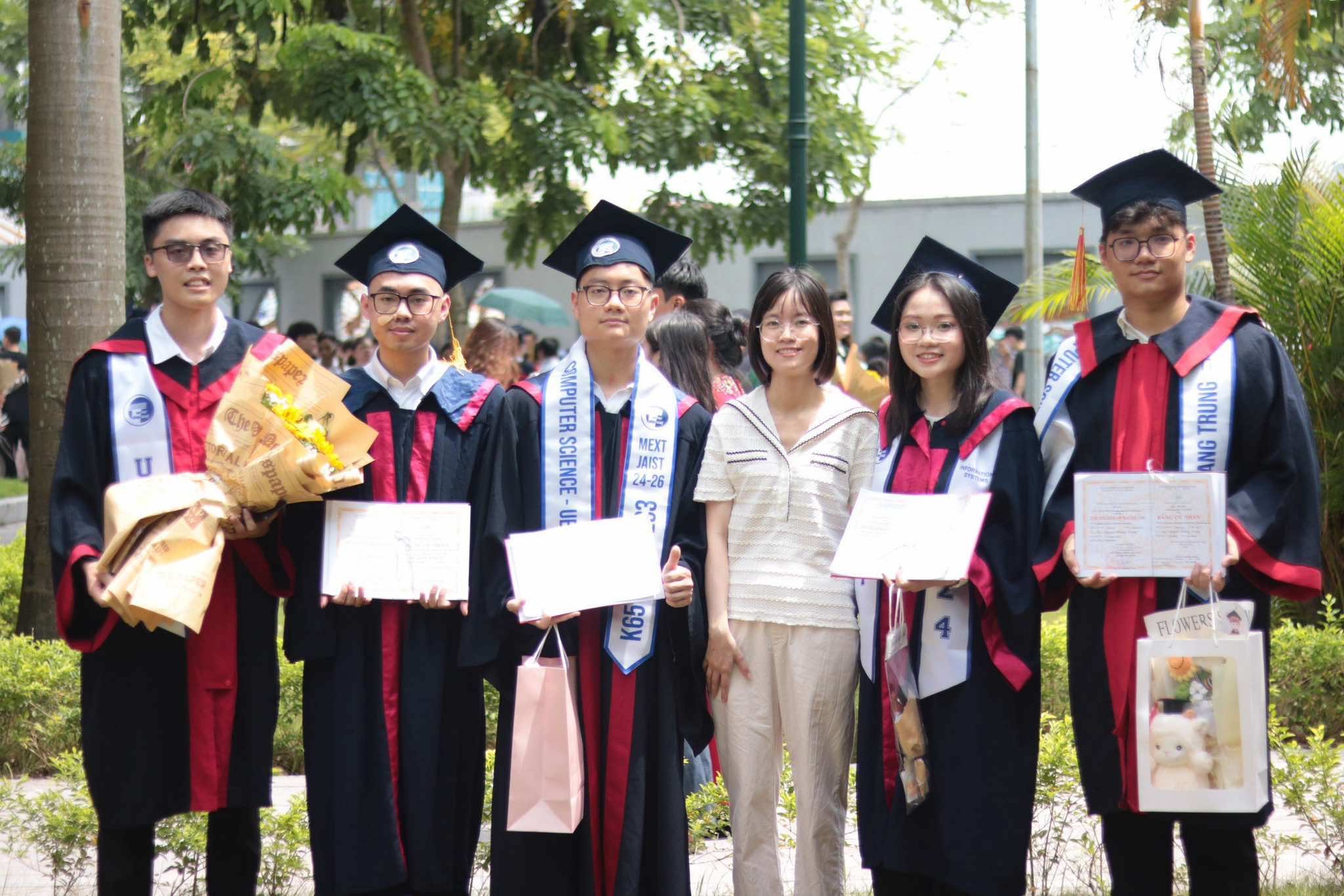 Cô Vương Thị Hải Yến – giảng viên khoa Công nghệ thông tin (đứng thứ ba, bên trái ảnh) đánh giá cao kỹ năng làm việc nhóm và sự chủ động của tân thủ khoa tốt nghiệp Nguyễn Thái Bình