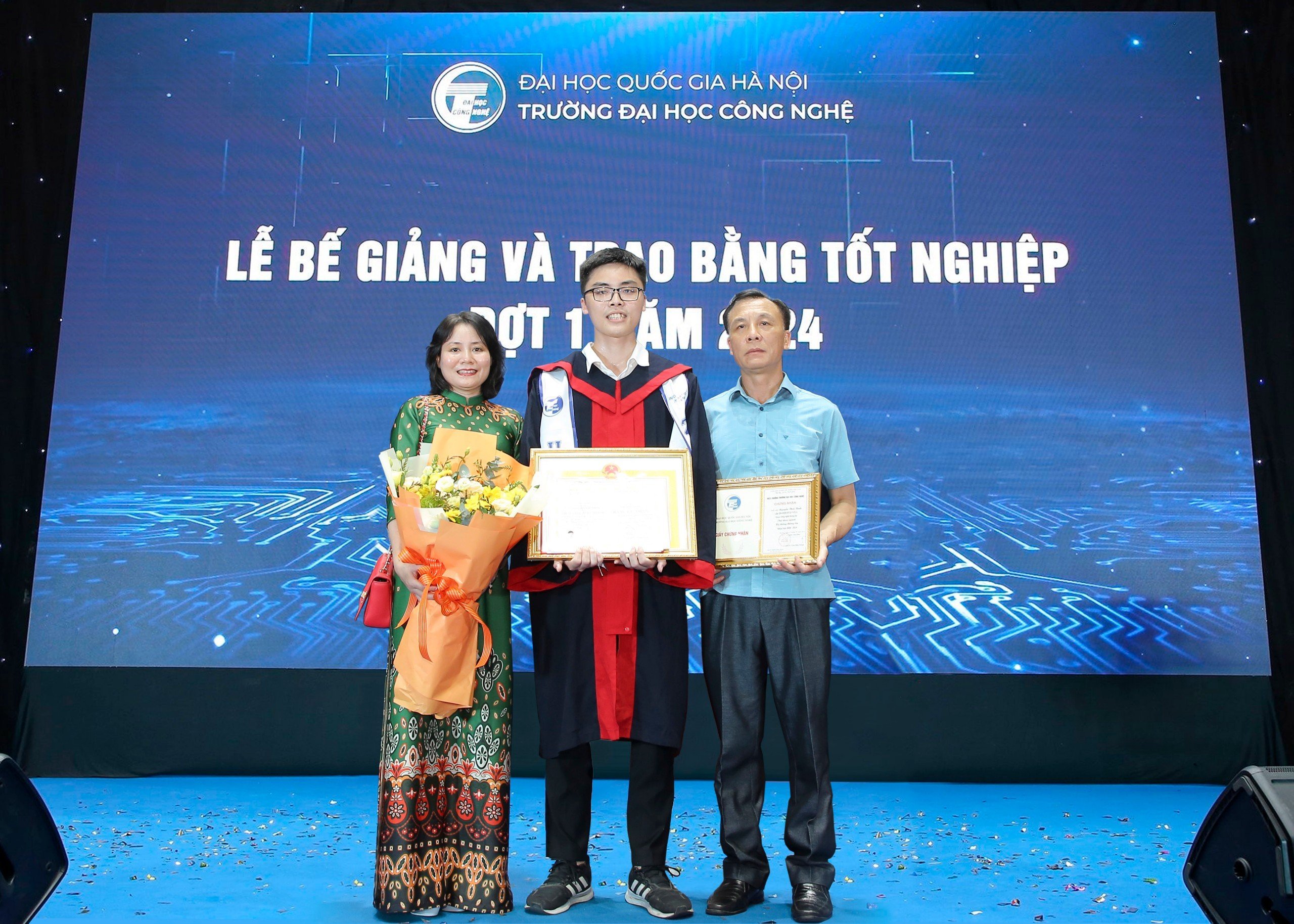 GS.TSKH Nguyễn Đình Đức – Chủ tịch Hội đồng Trường và GS.TS Chử Đức Trình – Hiệu trưởng Trường ĐH Công nghệ trao bằng tốt nghiệp cho Nguyễn Thái Bình