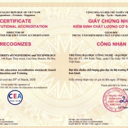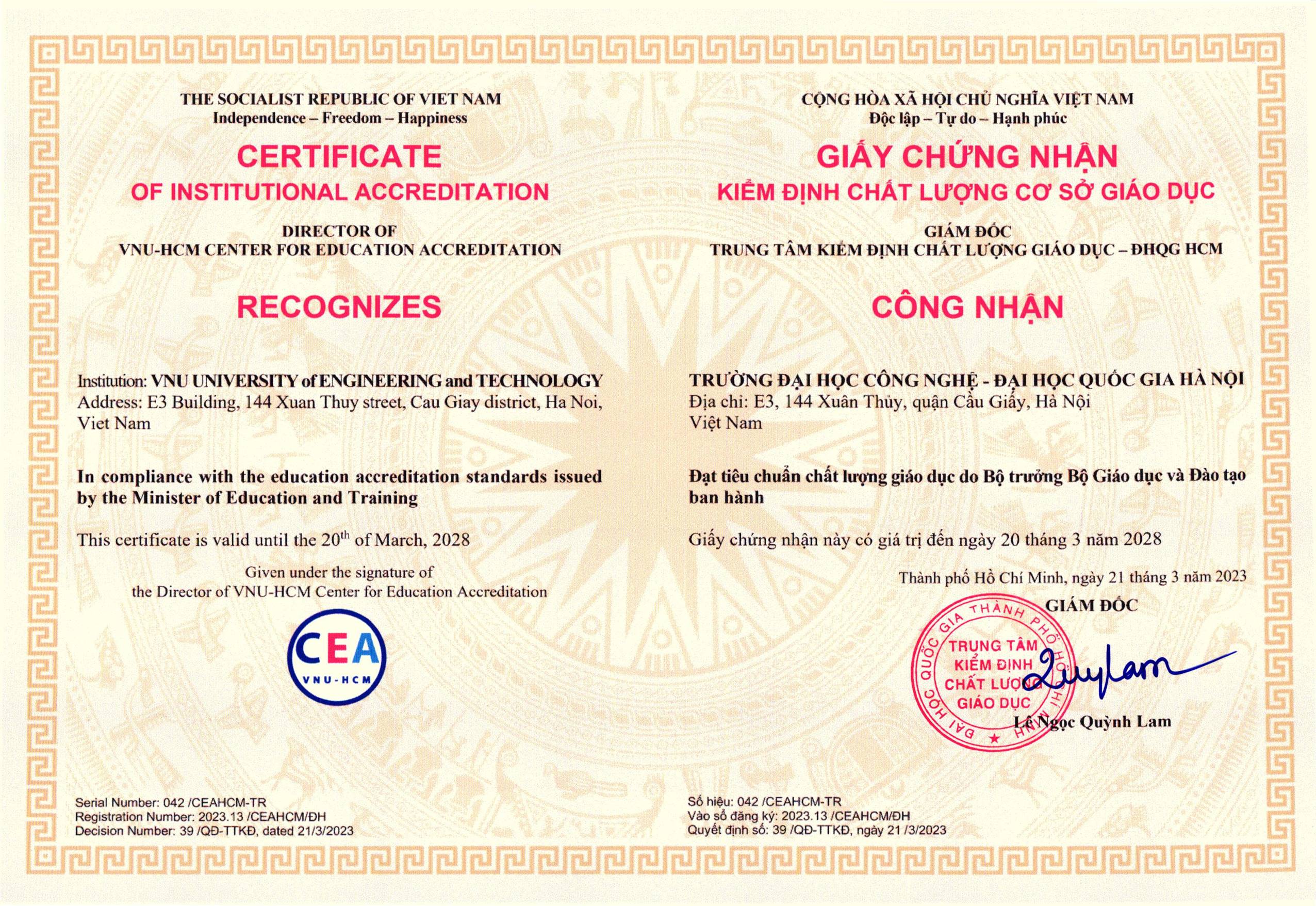 Ngày 21/3/2023, Trường ĐH Công nghệ – ĐHQGHN (VNU-UET) đã chính thức được cấp giấy chứng nhận kiểm định chất lượng cơ sở giáo dục theo quyết định số 39/QĐ-TTKT của Trung tâm kiểm định chất lượng giáo dục – Đại học Quốc gia Hồ Chí Minh.