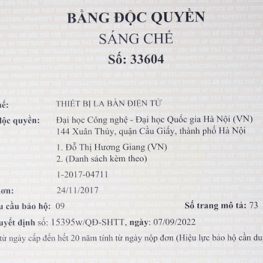 Cục Sở hữu trí tuệ, Bộ Khoa học và Công nghệ vừa cấp bằng độc quyền sáng chế mới cho nghiên cứu của Trường Đại học Công nghệ – Đại học Quốc gia Hà Nội tại Quyết định 15395w/QĐ-SHTT, ngày 07/9/2022. Sáng chế “Thiết bị la bàn điện tử” được cấp bằng độc quyền sáng chế do nhóm nghiên cứu của PGS.TS Đỗ Thị Hương Giang thực hiện.