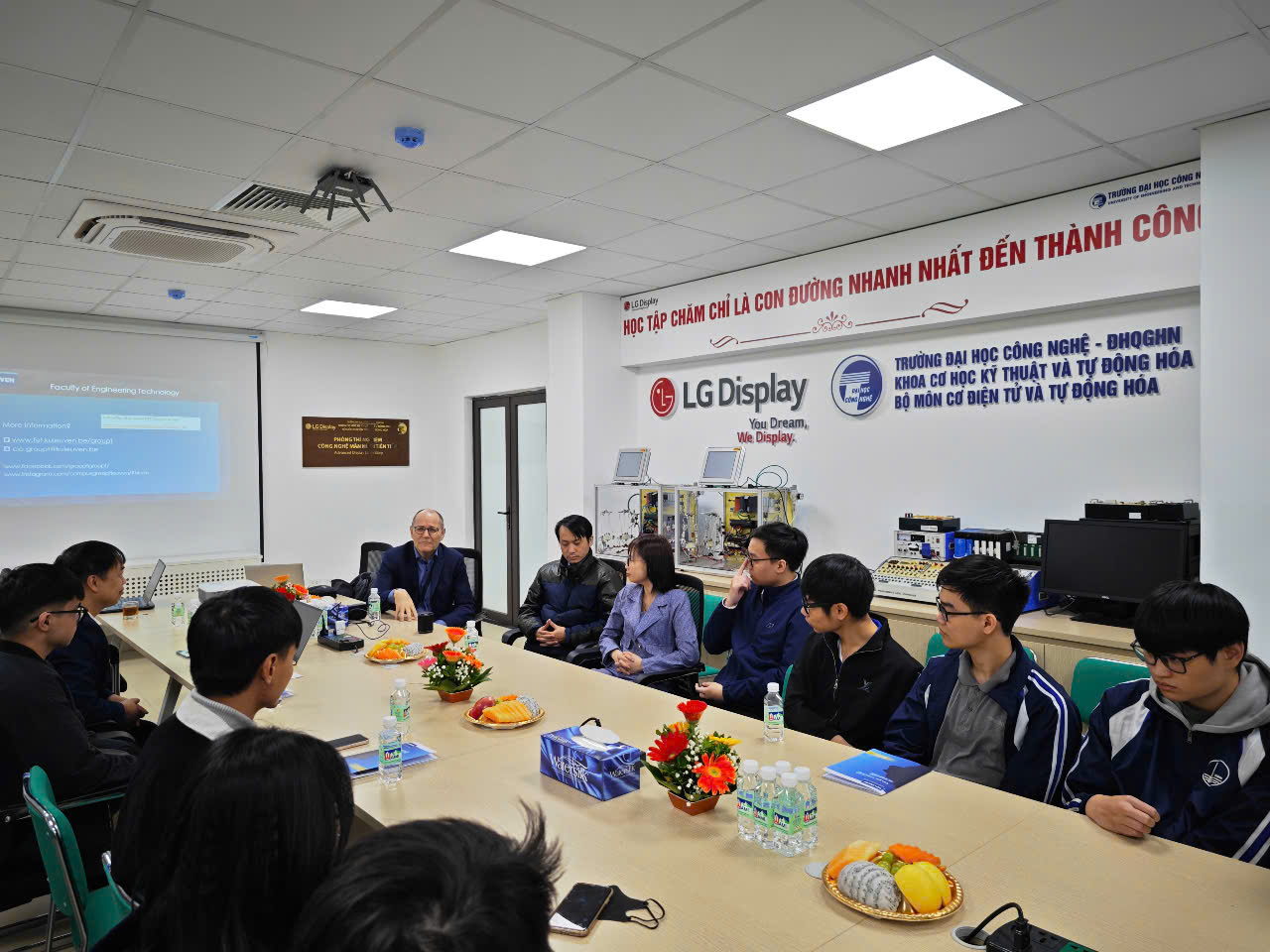 Trước khi ký kết, vào chiều ngày 01/4/2025, đại diện đoàn KU Leuven đã có buổi giao lưu với sinh viên năm thứ 2 và năm thứ 3 ngành Công nghệ kỹ thuật Cơ điện tử. Buổi trao đổi diễn ra sôi nổi, xoay quanh các vấn đề như điều kiện tham gia chương trình, yêu cầu học thuật, chính sách hỗ trợ của KU Leuven cũng như triển vọng nghề nghiệp sau khi tốt nghiệp.