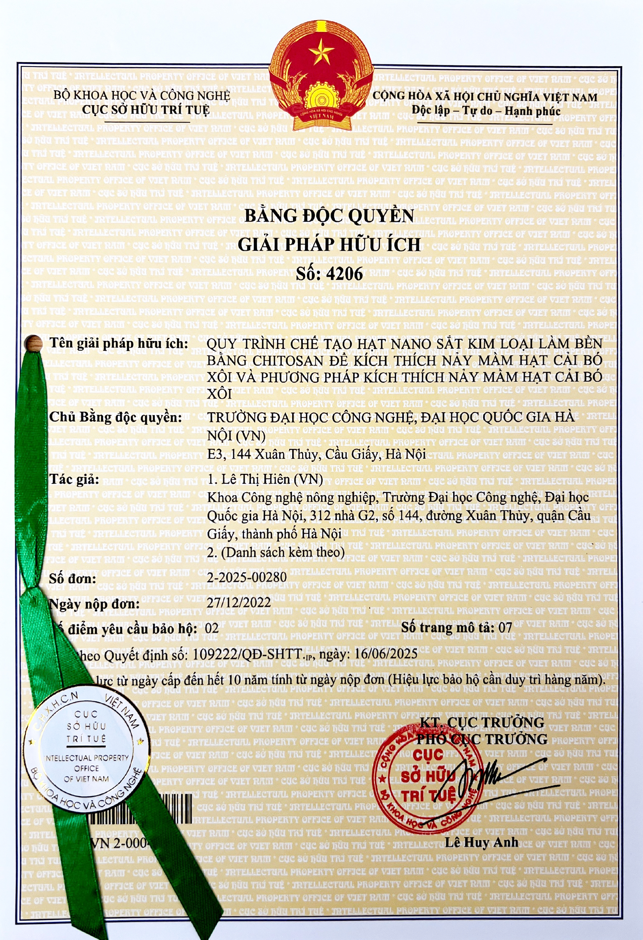 Bằng độc quyền giải pháp hữu ích số 4206 được cấp tại Quyết định số 109222/QĐ-SHTT ngày 16/6/2025: “Quy trình chế tạo hạt nano sắt kim loại làm bền bằng chitosan để kích thích này mầm hạt cải bó xôi và phương pháp kích thích nảy mầm hạt cải bó xôi” – TS. Lê Thị Hiên. Sáng chế thuộc lĩnh vực ứng dụng công nghệ nano trong nông nghiệp. Cụ thể là đề xuất quy trình chế tạo hạt nano sắt kim loại làm bền bằng chitosan (FeCS) ứng dụng kích thích nảy mầm hạt cải bó xôi, hạt vật liệu nano sắt kim loại làm bền bằng chitosan thu được theo quy trình này và phương pháp kích thích nảy mầm hạt cải bó xôi. Hạt FeCS tạo ra có khả năng làm tăng tỷ lệ nảy mầm hạt cải bó xôi lên 100% bằng cách ngâm hạt cải bó xôi trong dung dịch hạt FeCS này trước khi chuyển sang giá thể ươm hạt. Rút ngắn thời gian nảy mầm tối đa từ 7 ngày xuống còn 5 ngày.