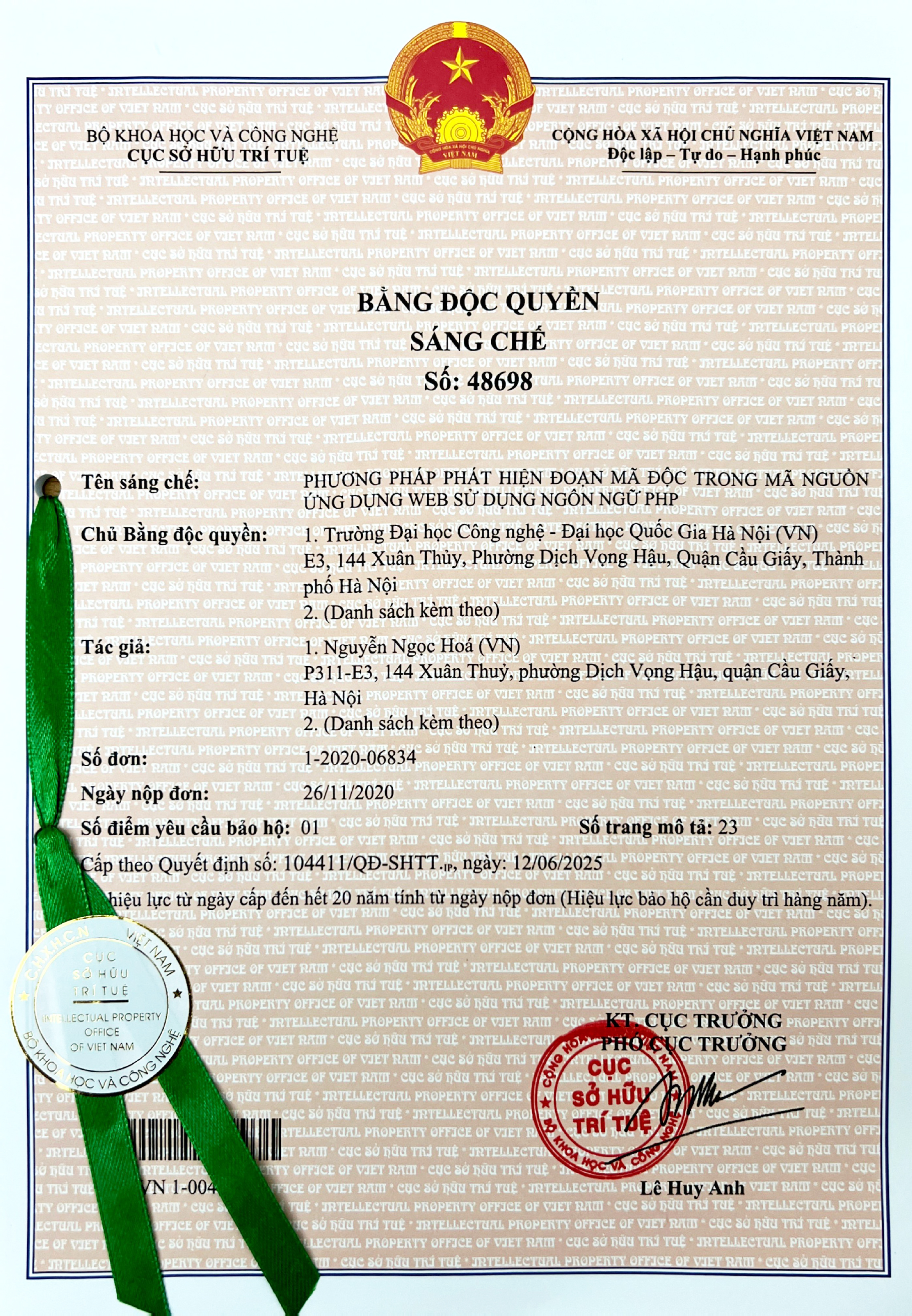 Bằng độc quyền sáng chế số 48698 được cấp tại Quyết định số 104411/QĐ-SHTT ngày 12/06/2025: “Phương pháp phát hiện đoạn mã độc trong mã nguồn ứng dụng web sử dụng ngôn ngữ PHP” – PGS.TS Nguyễn Ngọc Hóa. Sáng chế đề cập đến phương pháp phát hiện đoạn mã độc trong mã nguồn ứng dụng web sử dụng ngôn ngữ PHP. Trong đó phương pháp này sử dụng mô hình mạng nơron tích chập (CNN) để phát hiện các đoạn mã độc (WebShell). Phương pháp đề xuất dựa trên sự kết hợp giữa phương pháp đối sánh mẫu và phương pháp học sâu sử dụng mạng nơron tích chập.