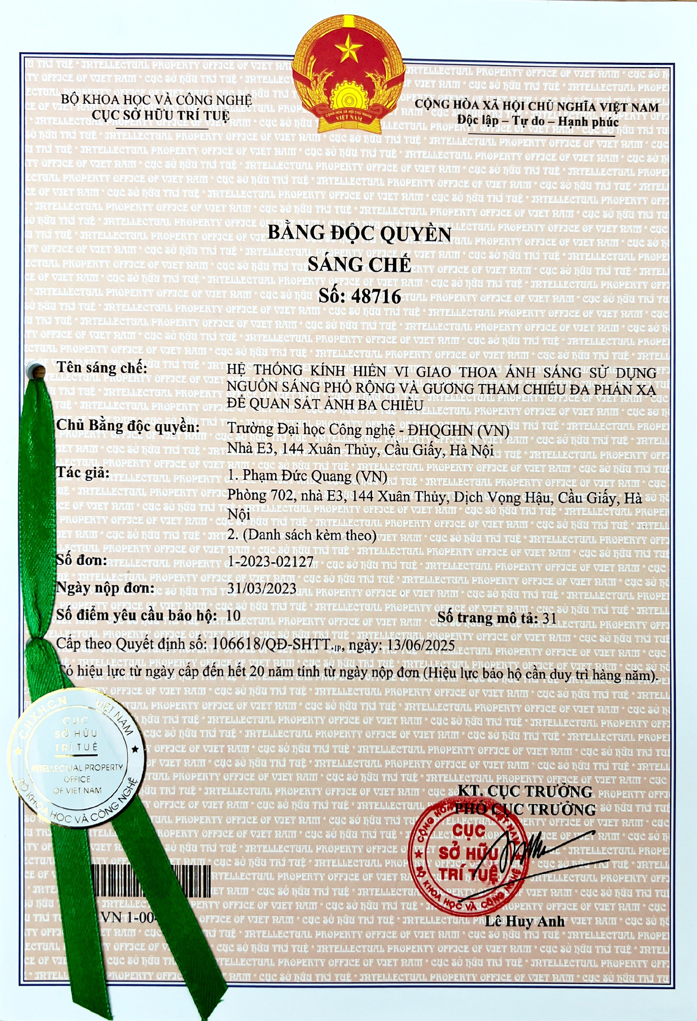 Bằng độc quyền sáng chế số 48716 được cấp tại Quyết định số 106618/QĐ-SHTT ngày 13/6/2025: “Hệ thống kính hiển vi giao thoa ánh sáng sử dụng nguồn sáng phổ rộng và gương tham chiếu đa phản xạ để quan sát ảnh đa chiều” – TS. Phạm Đức Quang. Sáng chế đề cập đến hệ thống kính hiển vi quan sát ảnh ba chiều, cụ thể hơn là hệ thống kính hiển vi giao thoa ánh sáng sử dụng nguồn sáng phổ rộng và gương tham chiếu đa phản xạ để quan sát ảnh ba chiều, chẳng hạn như đo chính xác cấu trúc ba chiều của các bề mặt trong các phòng thí nghiệm, trung tâm nghiên cứu vật liệu, trung tâm đo lường kiểm định, phòng kiểm tra chất lượng sản phẩm tại các nhà máy yêu cầu độ chính xác cao, hoặc ghi nhận hình ảnh ba chiều của các vi hạt, các mô tế bào dùng trong lĩnh vực y sinh. Hệ thống có các ưu điểm vượt trội so với các loại kính hiển vi thương mại bởi các tính năng tốc độ ghi nhận hình ảnh nhanh hơn, thực hiện trong thời gian thực; thông tin ba chiều được ghi nhận trong hai khung hình duy nhất giúp tăng tốc độ ghi nhận và giảm dung tích bộ nhớ khi lưu trữ thông tin ba chiều về vật thể; chi phí giảm xuống; phạm vi đo tương đối lớn đáp ứng các yêu cầu khắt khe trong các ứng dụng công nghiệp, y học. Bên cạnh đó, hệ thống cũng có thể chuyển đổi thành kính hiển vi ghi nhận ảnh hai chiều truyền thống một cách dễ dàng.
