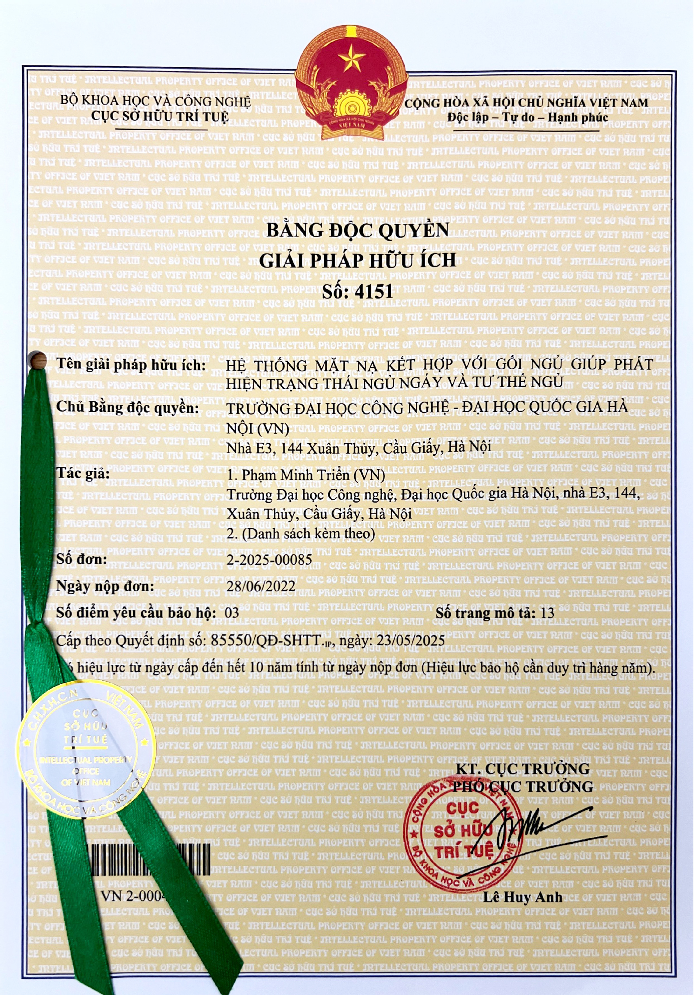 Bằng độc quyền giải pháp hữu ích số 4151 được cấp tại Quyết định số 85550/QĐ-SHTT ngày 23/5/2025: “Hệ thống mặt nạ kết hợp với gối ngủ giúp phát hiện trạng thái ngủ ngáy và tư thế ngủ” – PGS.TS Phạm Minh Triển. Sáng chế đề cập đến hệ thống mặt nạ kết hợp với gối ngủ giúp phát hiện trạng thái ngủ ngáy và tư thế ngủ. Cụ thể hơn sáng chế đề cập đến hệ thống gối kết hợp với mặt nạ ngủ tự động phát hiện trạng thái ngủ ngáy và tự động điều chỉnh đầu giúp ngừng ngáy, đồng thời thông qua các thông tin về trạng thái ngủ ngáy và tư thế ngủ nói trên đưa ra mức độ cảnh cáo nguy cơ mắc bệnh lý ngừng thở tắc nghẽn khi ngủ ở người dùng.