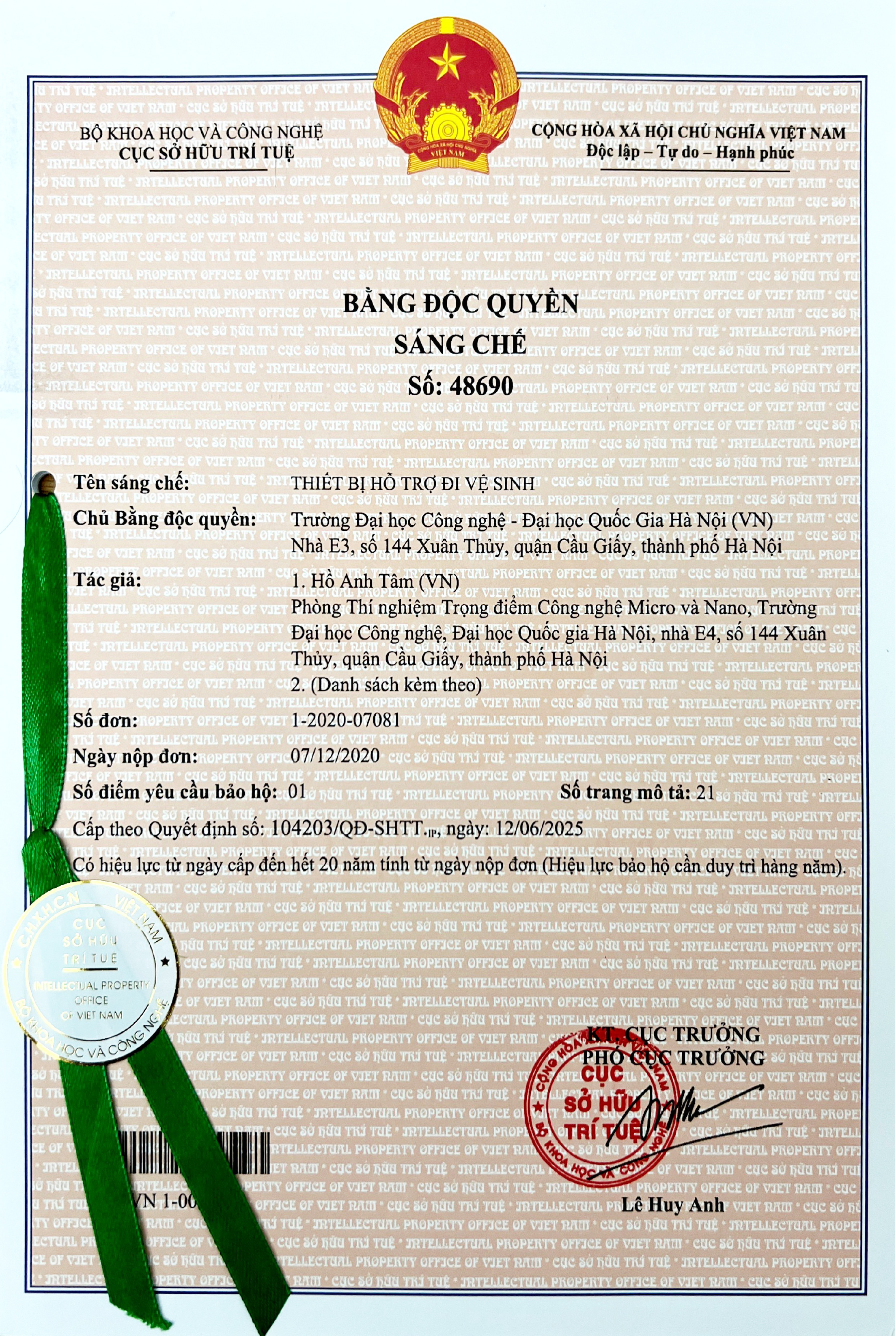 Bằng độc quyền sáng chế số 48690 được cấp tại Quyết định số 104203/QĐ-SHTT ngày 12/6/2025: “Thiết bị hỗ trợ đi vệ sinh” – ThS. Hồ Anh Tâm. Sáng chế đề cập tới thiết bị hỗ trợ đi vệ sinh cho những người gặp khó khăn trong di chuyển, tích hợp với hệ thống phun rửa làm vệ sinh và phun khí xì khô. Thiết bị là công cụ góp phần nâng cao dịch vụ chăm sóc y tế và sức khỏe cho bệnh nhân. Đồng thời, sản phẩm được sử dụng trong thời gian dài sẽ giúp giảm thiểu rác thải khó phân hủy ra môi trường và đem lại hiệu quả kinh tế. Bên cạnh đó, sản phẩm còn giải phóng sức lao động cho người chăm sóc bệnh nhân và nhân viên y tế.