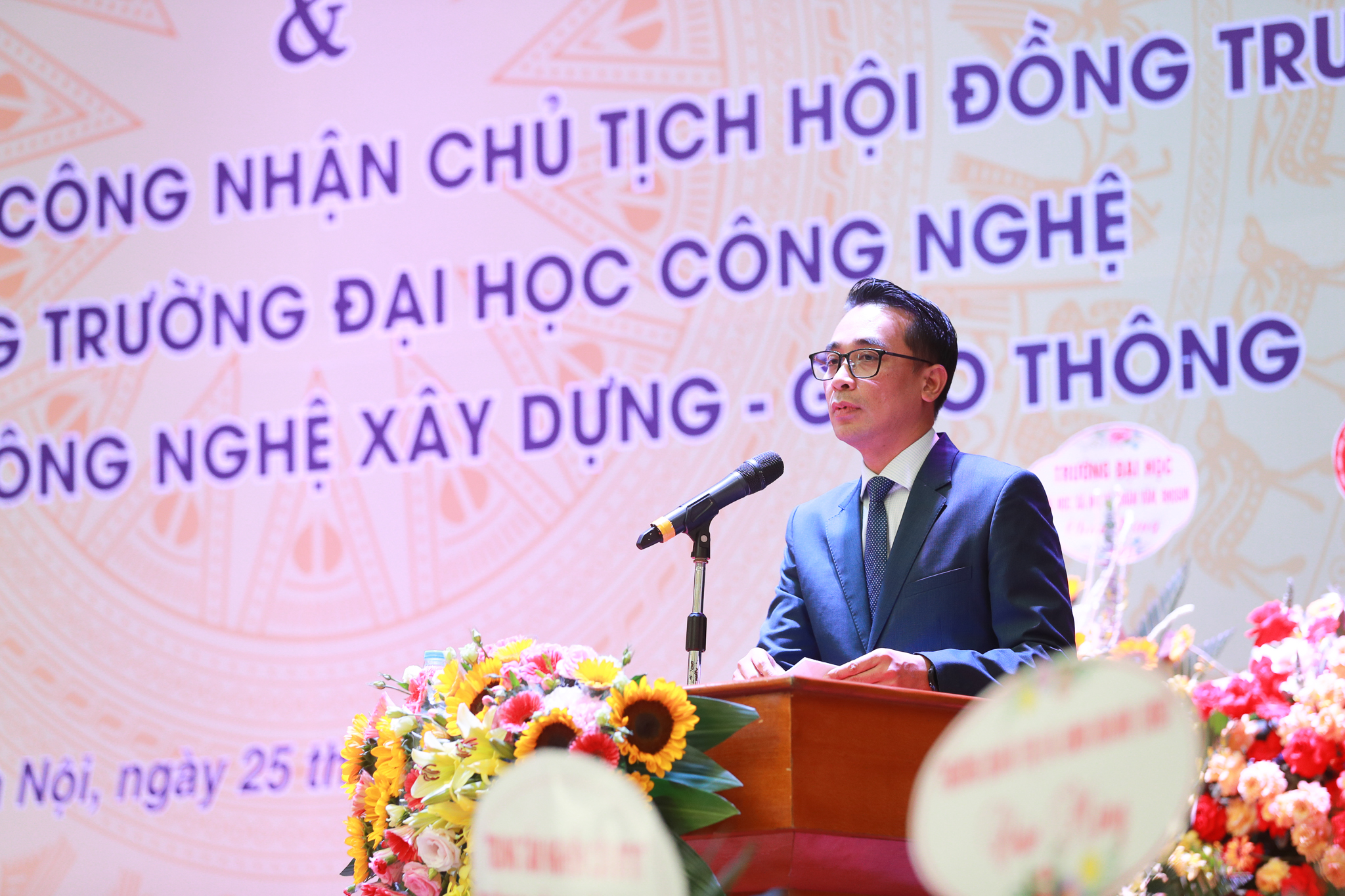 GS.TSKH Nguyễn Đình Đức, Chủ tịch Hội đồng trường, Chủ nhiệm Khoa Công nghệ Xây dựng – Giao thông phát biểu tại buổi lễ