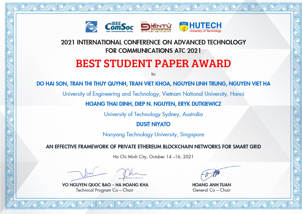 Báo cáo “An Effective Framework of Private Ethereum Blockchain Networks for Smart Grid” (tiếng Việt: “Mô hình mạng chuỗi khối Ethereum riêng tư và hiệu quả sử dụng cho lưới điện thông minh”) gồm nhóm tác giả Viện Tiên tiến về Kỹ thuật và Công nghệ (Trường Đại học Công nghệ – Đại học Quốc gia Hà Nội) thực hiện, đạt giải Best Student Paper tại Hội nghị Quốc tế về Công nghệ Tiên tiến trong Truyền thông 2021.