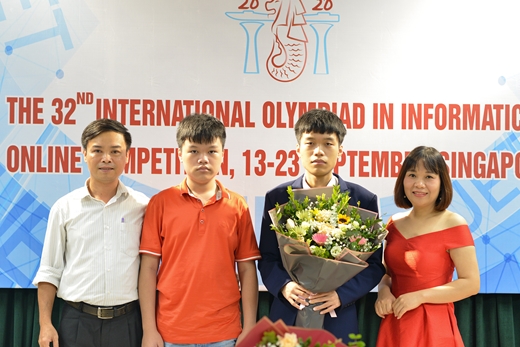 Bùi Hồng Đức (thứ hai, bên phải ảnh) chụp ảnh lưu niệm cùng thầy Hồ Đắc Phương (ngoài cùng, bên phải ảnh) tại lễ bễ mạc Olympic Tin học quốc tế năm 2020