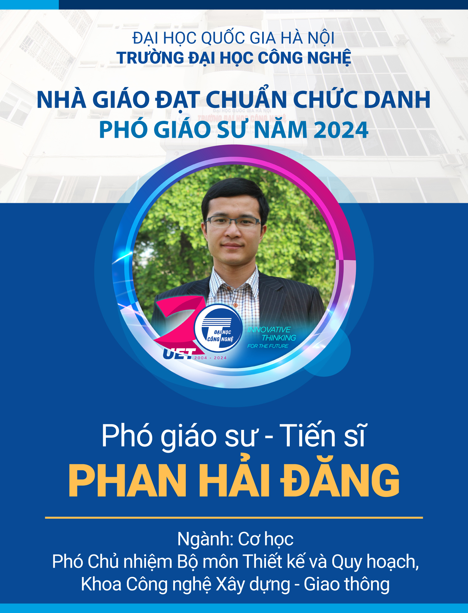 Tân Phó Giáo sư Phan Hải Đăng (Phó Chủ nhiệm Bộ môn Thiết kế và Quy hoạch, Khoa Công nghệ Xây dựng – Giao thông, Trường Đại học Quốc gia Hà Nội) tốt nghiệp Tiến sĩ ngành Kỹ thuật Cơ khí tại Đại học Quốc gia Pusan, Hàn Quốc, dưới sự hướng dẫn của GS. Younho Cho (ĐHQG Pusan) và GS. Jan Achenbach (Đại học Northwestern, Hoa Kỳ). Hướng nghiên cứu chính của anh tập trung vào sóng siêu âm trong các cấu trúc composite với các ứng dụng tiên tiến trong phát hiện khuyết tật, đánh giá đặc tính vật liệu, và siêu âm định lượng xương.