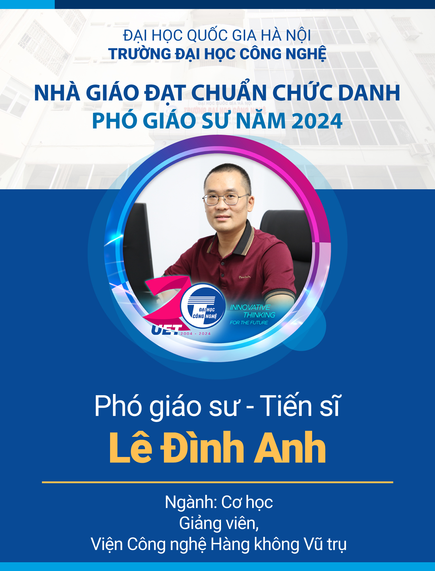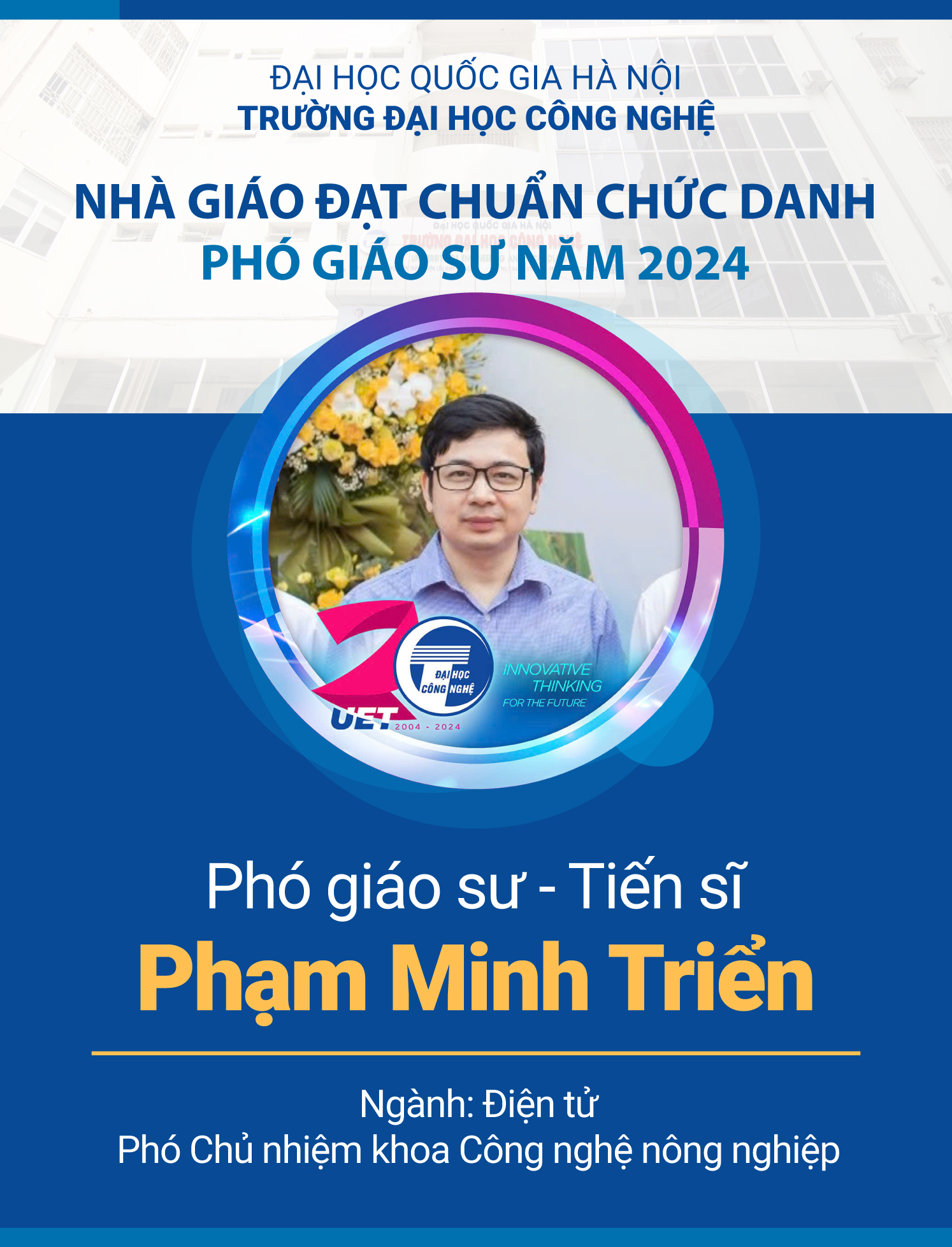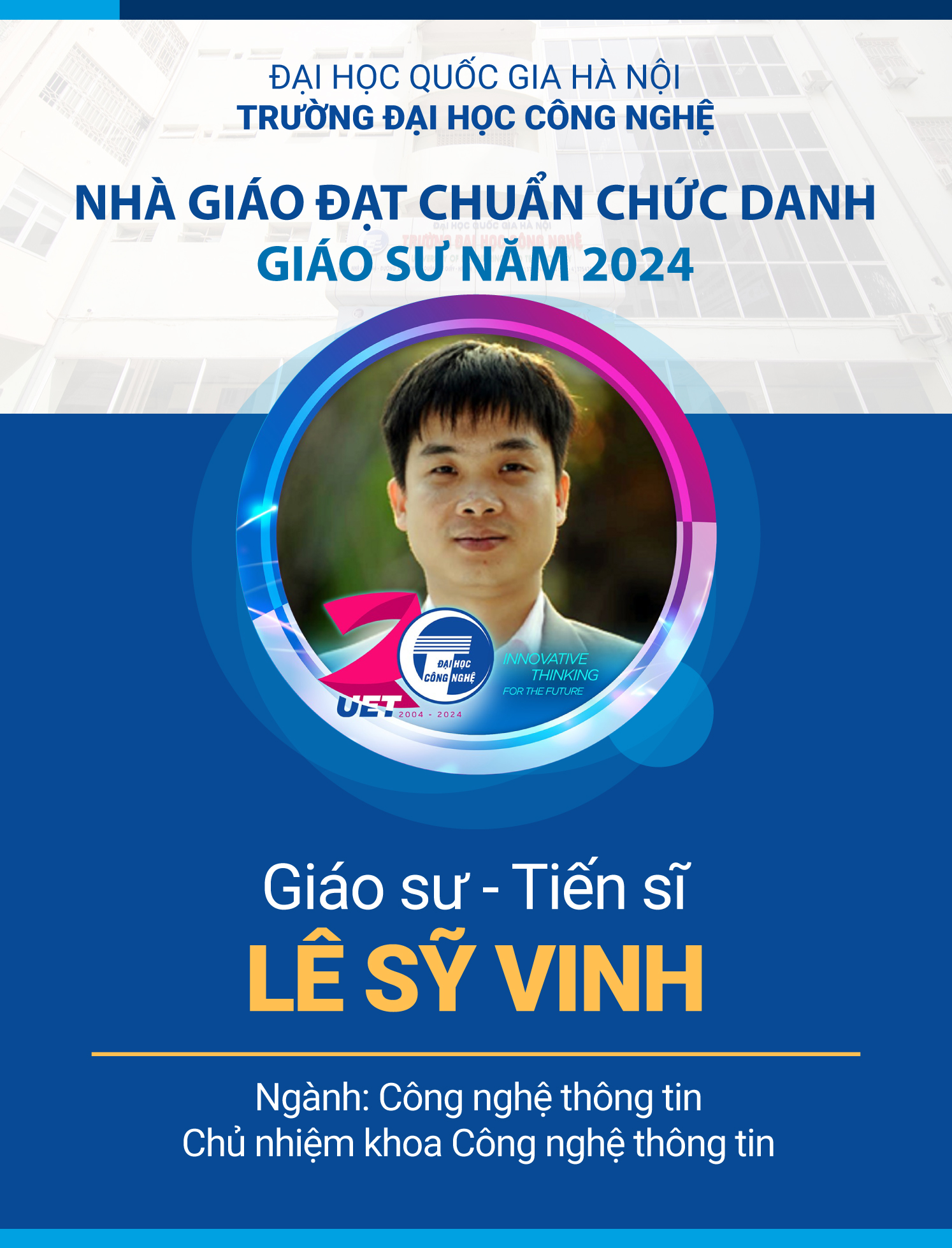 Ngày 19/11/2024, Chủ tịch Hội đồng Giáo sư Nhà nước đã ban hành quyết định số 89/QĐ-HĐGSNN về công nhận đạt tiêu chuẩn chức danh giáo sư, phó giáo sư năm 2024. Năm nay, Trường Đại học Công nghệ – Đại học Quốc gia Hà Nội (VNU-UET) có thêm 06 nhà giáo được công nhận đạt tiêu chuẩn chức danh giáo sư, phó giáo sư năm 2024.