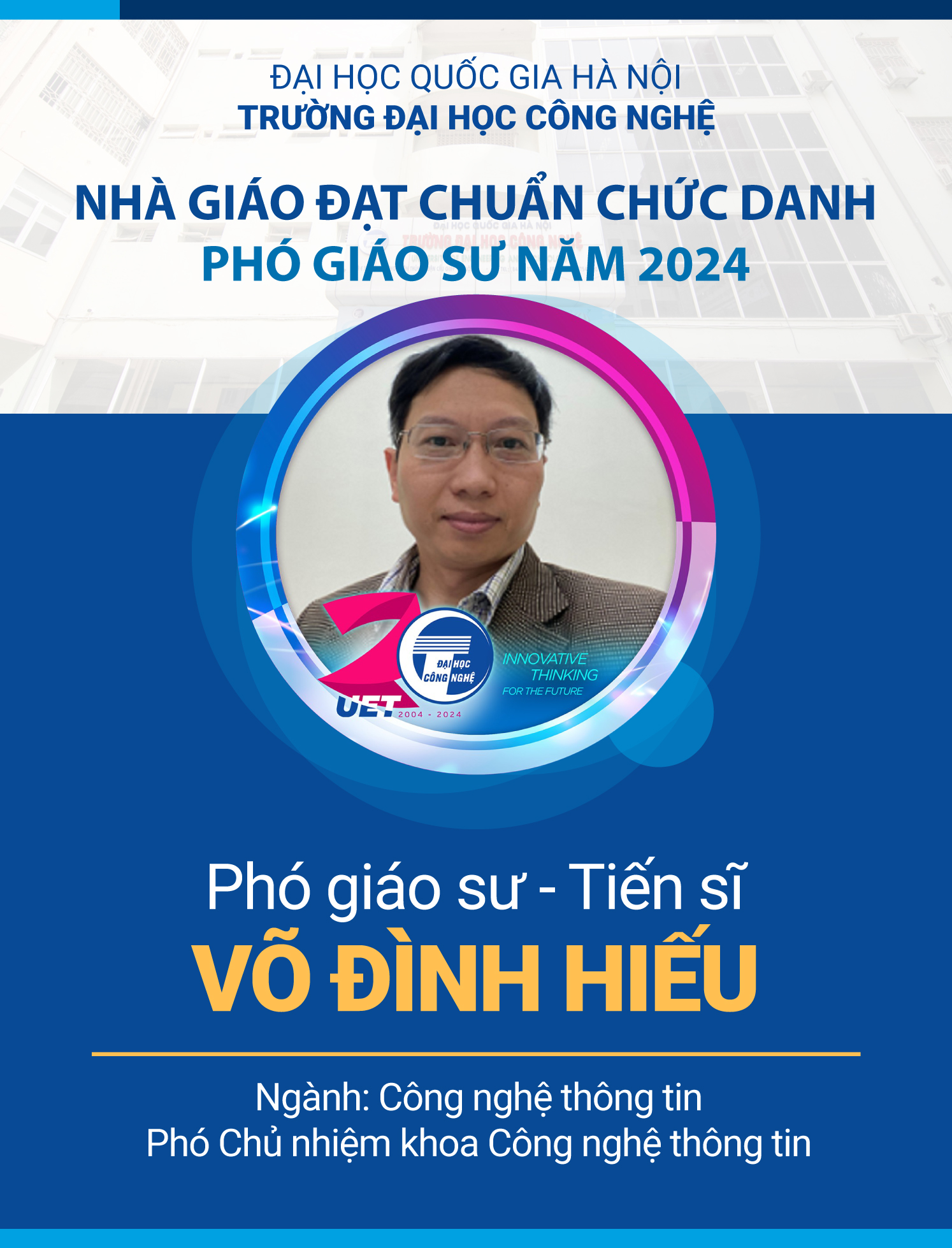 Tân Phó Giáo sư Võ Đình Hiếu (Phó Chủ nhiệm Khoa Công nghệ thông tin) tốt nghiệp tiến sĩ ngành Công nghệ thông tin tại Viện Khoa học và Công nghệ tiên tiến Nhật Bản. Các hướng nghiên cứu chính tập trung vào kiến trúc phần mềm và phân tích chương trình.