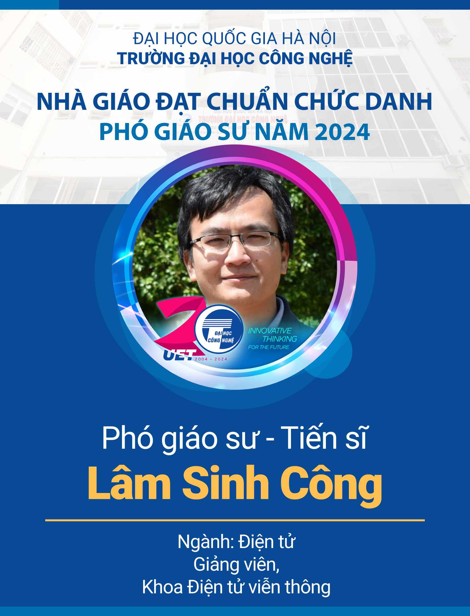 Tân Phó Giáo sư Lâm Sinh Công (Khoa Điện tử viễn thông) tốt nghiệp tiến sĩ ngành Kỹ thuật tại Đại học Công nghệ Sydney, Úc. Và các chủ đề nghiên cứu chính là phân tích, đánh giá và nâng cao hiệu năng mạng truyền thông di động với 2 hướng chính là hiệu năng mạng mất độ thấp và hiệu năng mạng mật độ cao.