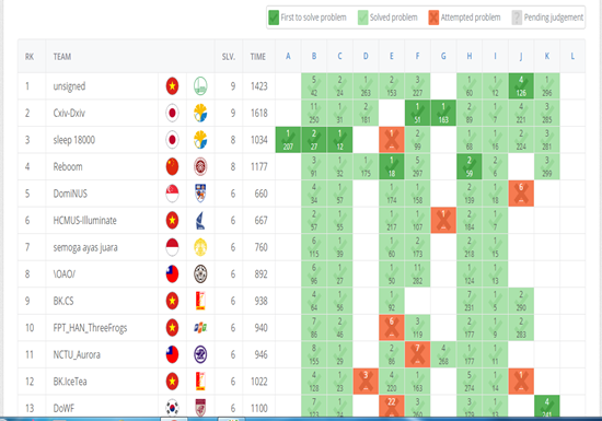 Trong gần 4 tiếng đầu tiên, các đội đến từ Tokyo và Bắc Kinh luôn dẫn đầu. Ở những phút cuối cùng, với bứt phá không ngờ, đội tuyển Unsigned gồm các sinh viên K62 là Nguyễn Đinh Quang Minh, Phạm Cao Nguyên và Lê Quang Tuấn đã giành ngôi Vô địch với 9 bài. Các vị trí kế tiếp là đội tuyển CX-DXIV từ Đại học Tokyo (giải Nhất), đội tuyển HCMUS – Illuminate của Đại học Khoa học Tự nhiên TP.HCM (giải Nhì), đội FPT_HAN_ThreeFrogs của Đại học FPT (giải Ba).