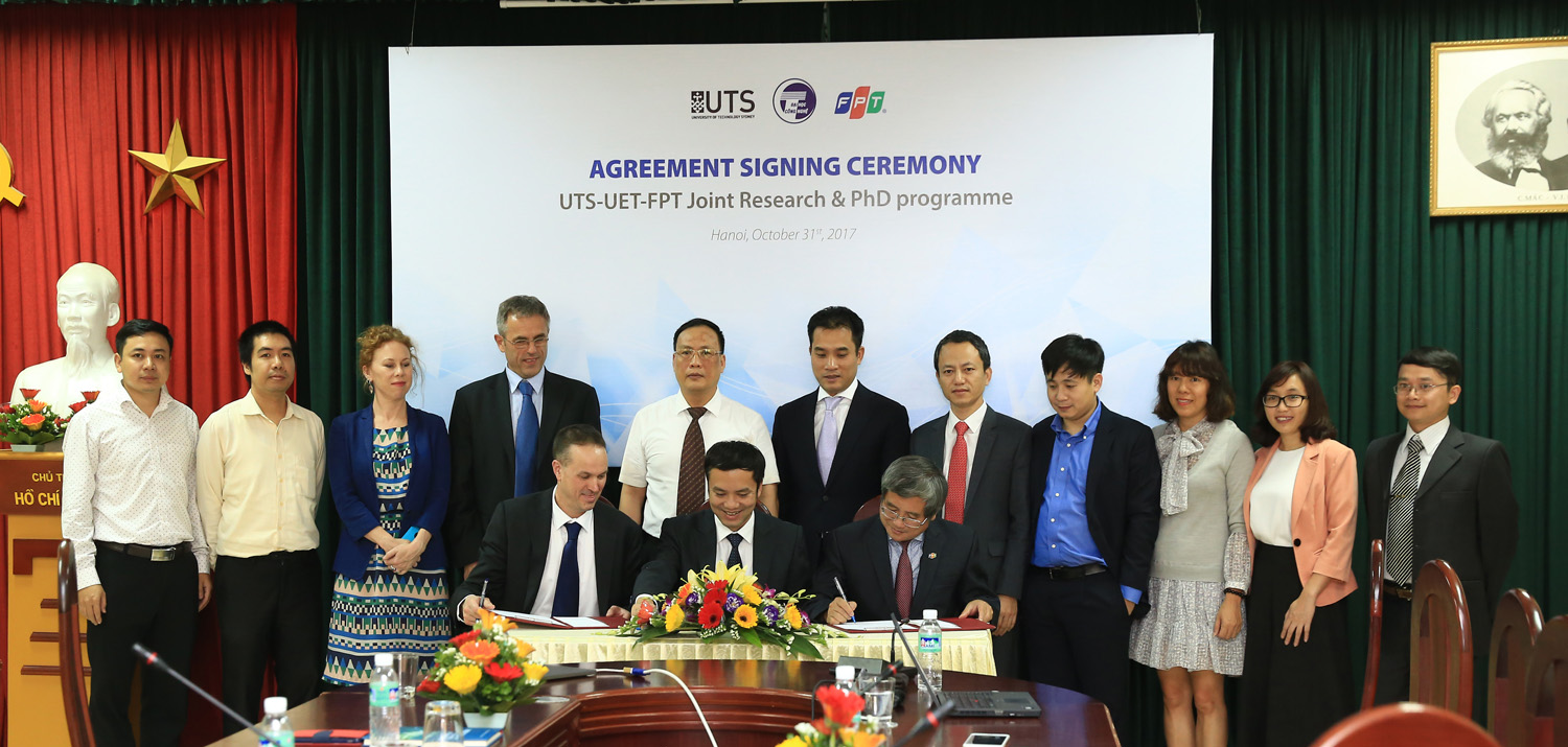 Trường ĐHCN và Trường ĐHCN Sydney đã ký kết hợp tác 3 bên với Tập đoàn FPT trong lĩnh vực đào tạo tiến sĩ về nhân lực công nghệ chất lượng cao