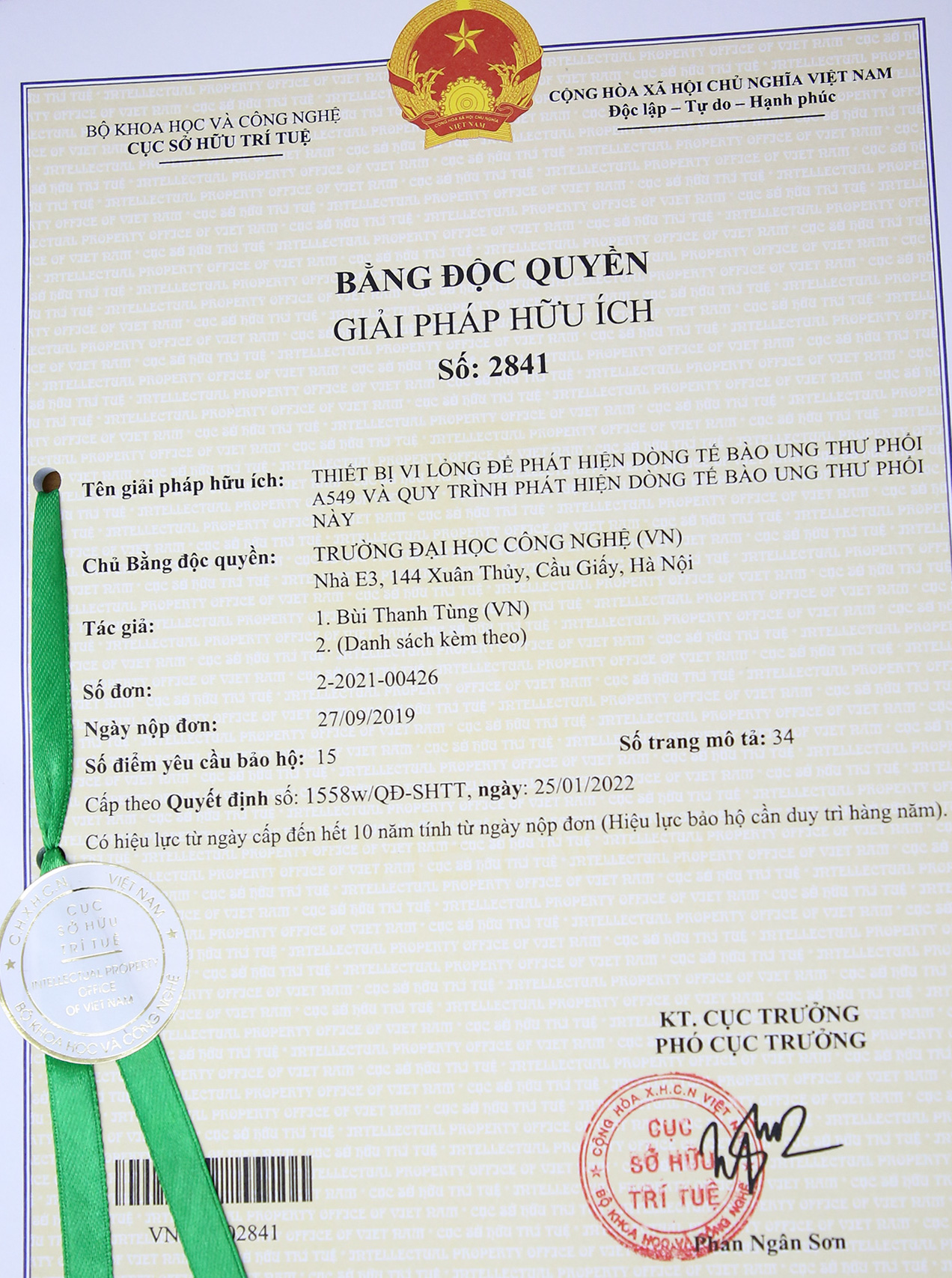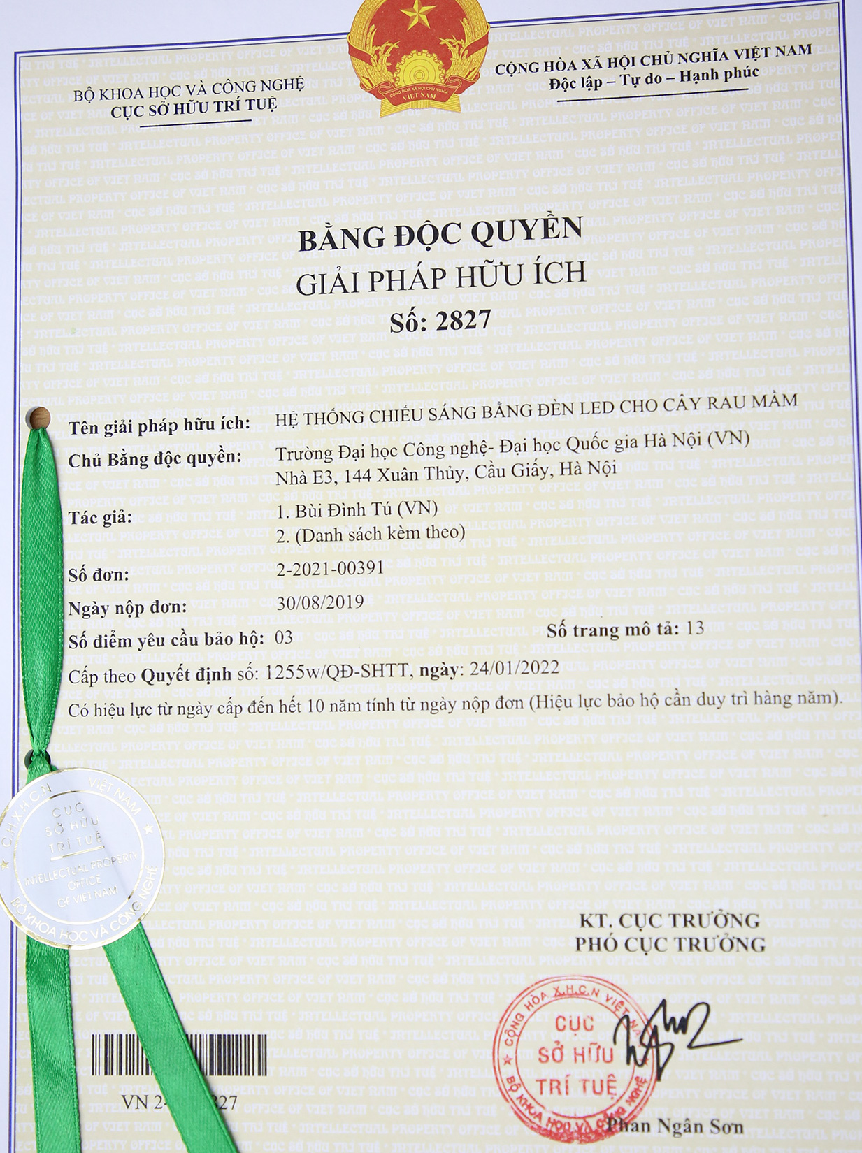 Hai sáng chế độc quyền vừa được Cục Sở hữu trí tuệ, Bộ KH&CN cấp bằng có tên: “Hệ thống chiếu sáng bằng đèn led cho các cây rau mầm” của tác giả TS. Bùi Đình Tú và ThS. Nguyễn Đăng Cơ cùng nhóm nghiên cứu Trường ĐHCN; “Thiết bị vi lỏng để phát hiện dòng tế bào ung thư phổi A549 và quy trình phát hiện dòng tế bào ung thư phổi này” của tác giả PGS.TS. Bùi Thanh Tùng cùng nhóm nghiên cứu gồm cán bộ của Trường ĐHCN và Trường Đại học Khoa học tự nhiên (ĐHQGHN).