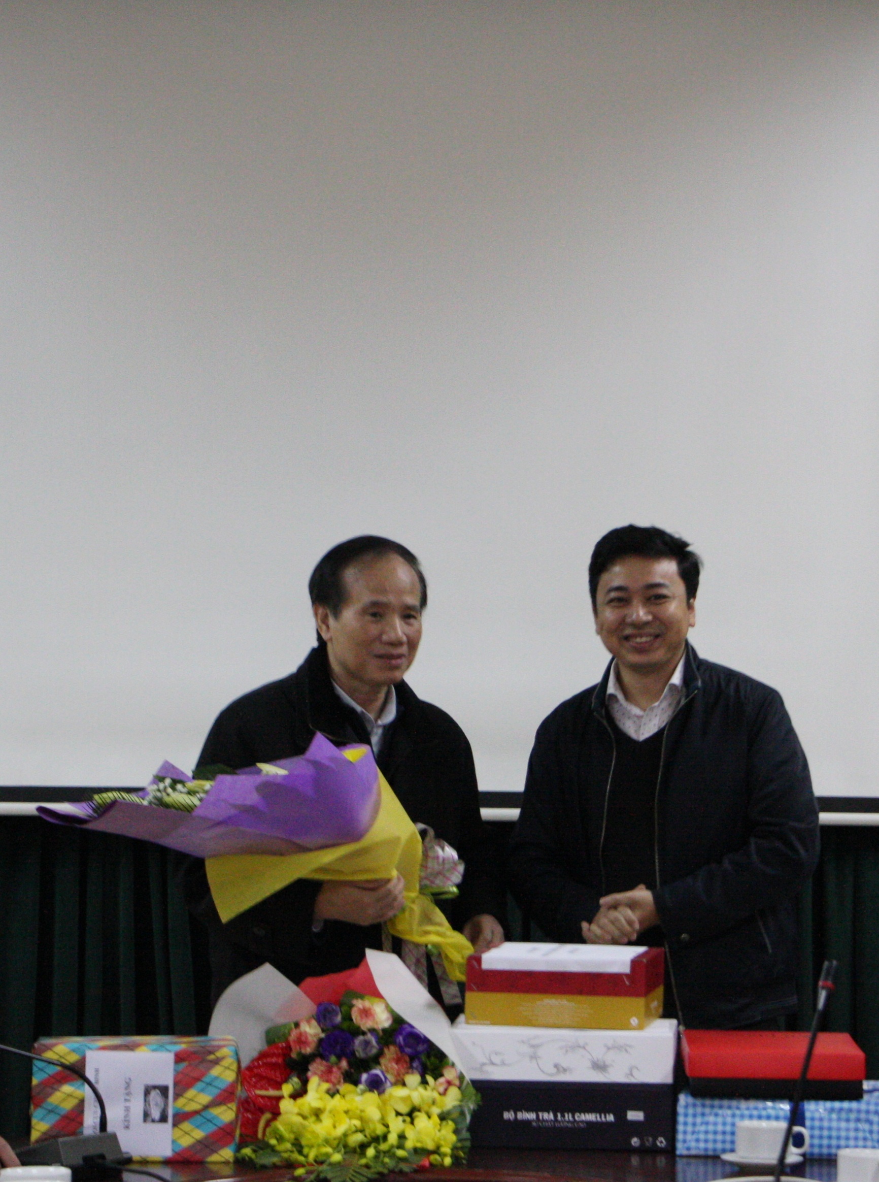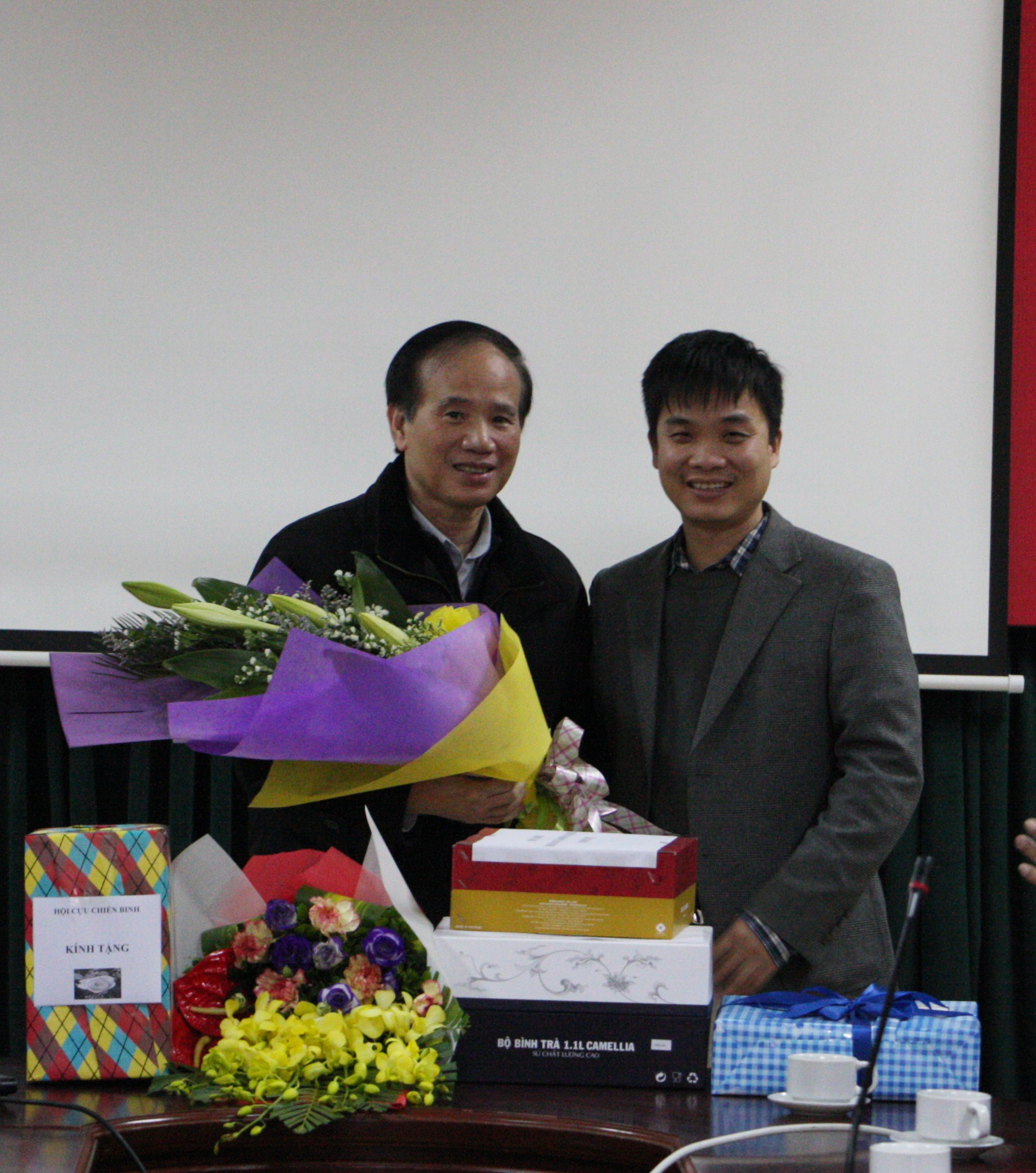 Phó Trưởng phòng KHCN&HTPT Phạm Minh Triển (bên phải ảnh) gửi tặng quà đến PGS.TS. Trần Quang Vinh