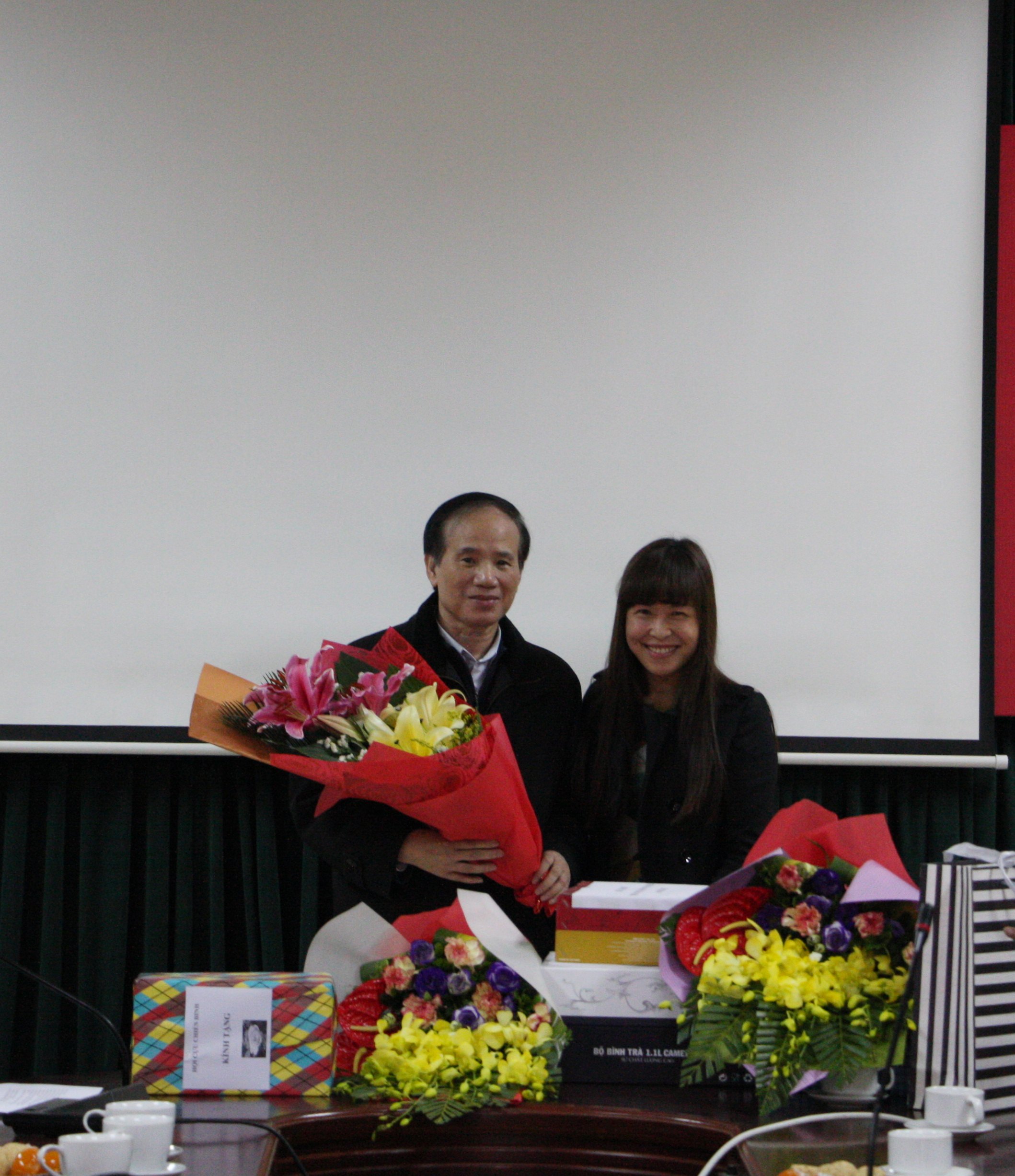Phó Chủ nhiệm khoa VLKT&CNNN Đỗ Thị Hương Giang (bên phải ảnh) tặng quà PGS.TS. Trần Quang Vinh