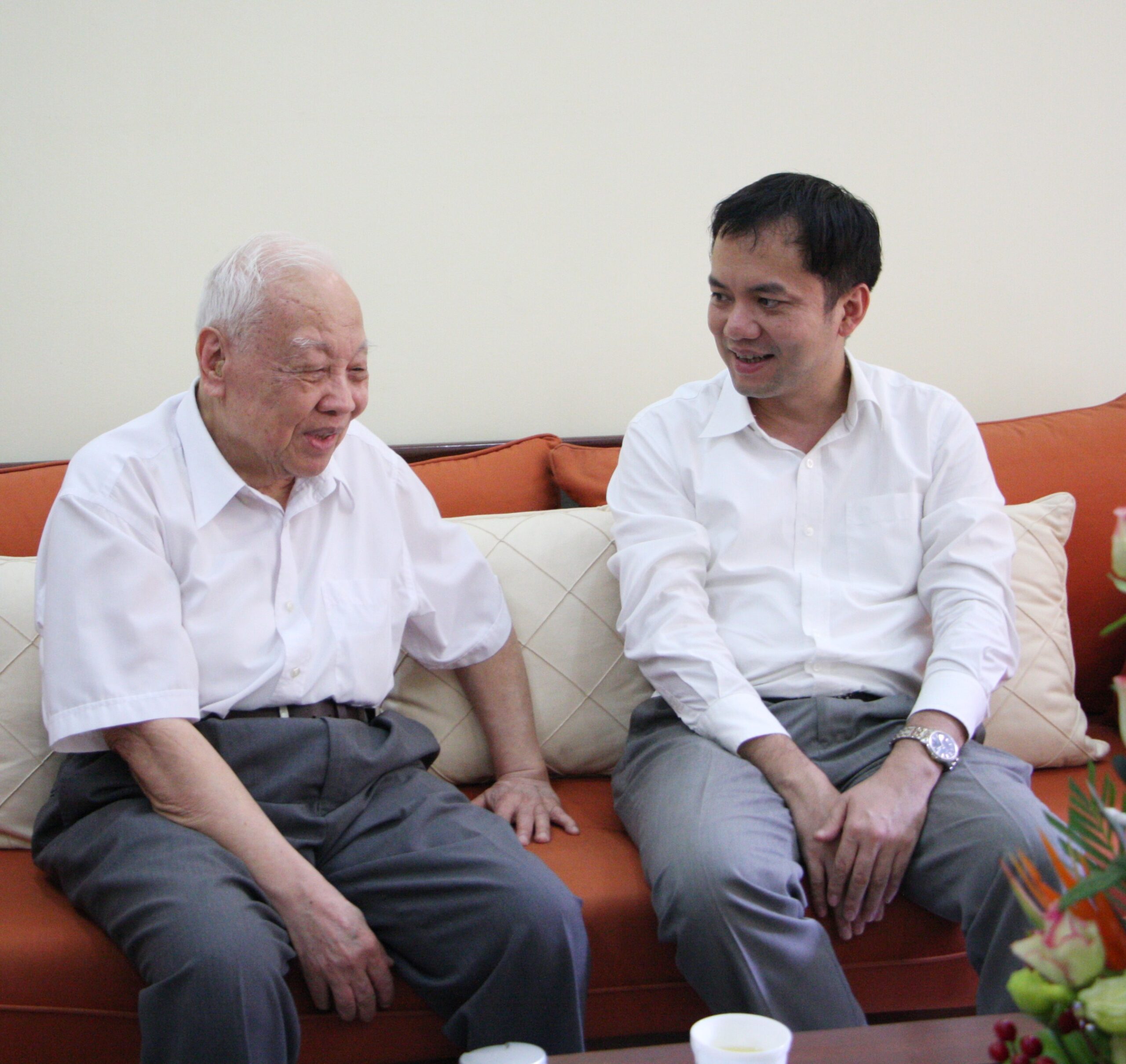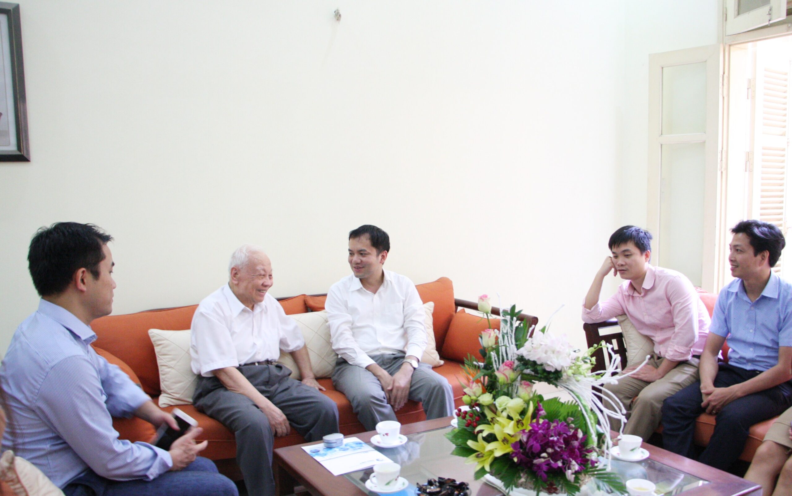 PGS.TS. Nguyễn Việt Hà – Hiệu trưởng nhà trường (áo trắng, bên phải ảnh) dẫn đầu đến thăm hỏi Nhà giáo lão thành GS.VS. Nguyễn Văn Hiệu (áo trắng, bên trái ảnh)
