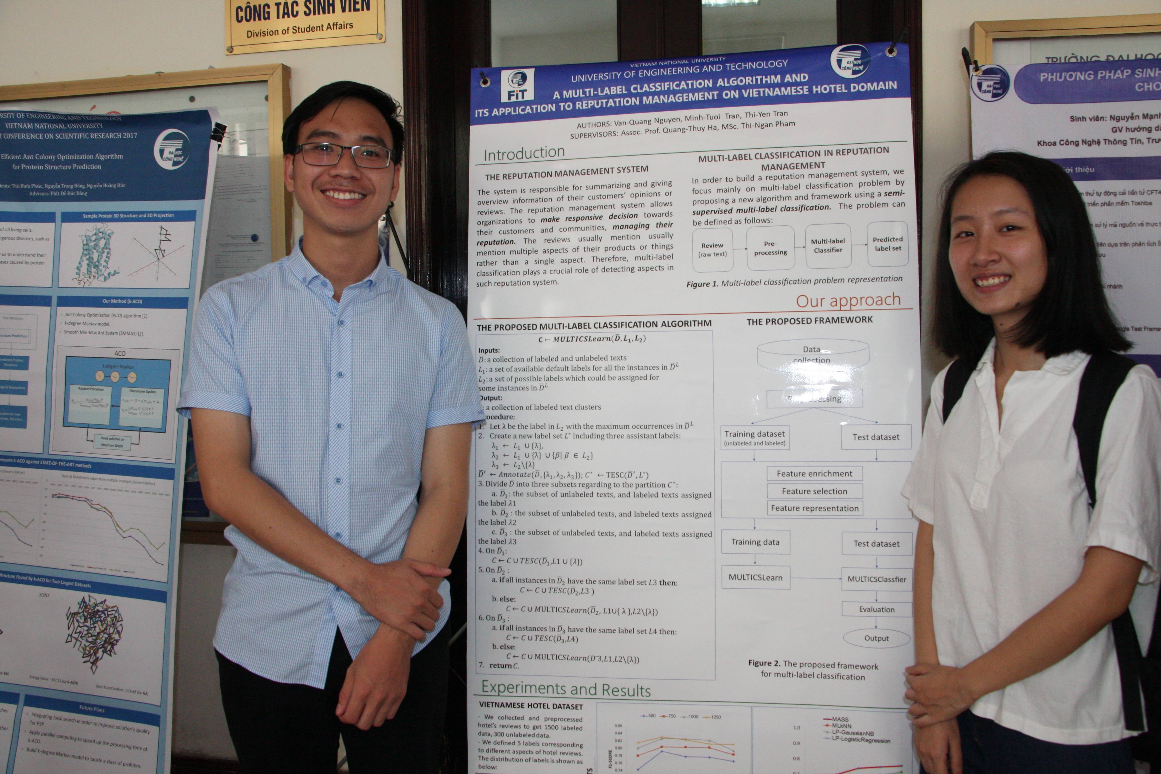Đề tài “A multi-label classification algorithm and its application to reputation management on Vietnamese hotel domain” (Một thuật toán phân lớp đa nhãn và ứng dụng của nó trong quản lý danh tiếng trong miền dữ liệu tiếng Việt về khách sạn) của nhóm sinh viên nghiên cứu khoa học tại Phòng thí nghiệm Khoa học Dữ liệu và Công nghệ Tri thức (Khoa Công nghệ thông tin, Trường Đại học Công nghệ) đã đoạt Giải Ba giải thưởng Sinh viên nghiên cứu khoa học cấp Bộ GD&ĐT và Giải Nhì cấp ĐHQGHN.