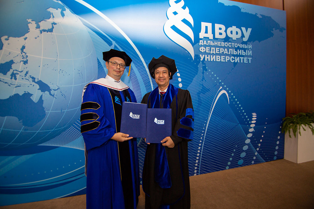 Tham dự phiên họp mở rộng Hội đồng Khoa học và Đào tạo của ĐH Tổng hợp Liên bang Viễn Đông (FEFU) vào ngày 14/9 vừa qua, Giám đốc ĐHQGHN Nguyễn Kim Sơn đã vinh dự được trao bằng Tiến sĩ danh dự từ FEFU – một trong những đại học lớn nhất ở Liên bang Nga vì những đóng góp trong nghiên cứu văn hóa Á Đông và phát triển hợp tác giáo dục.