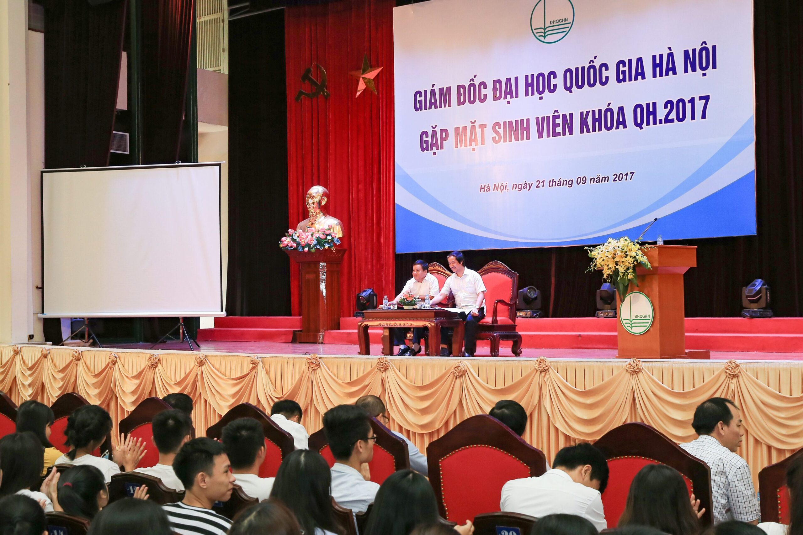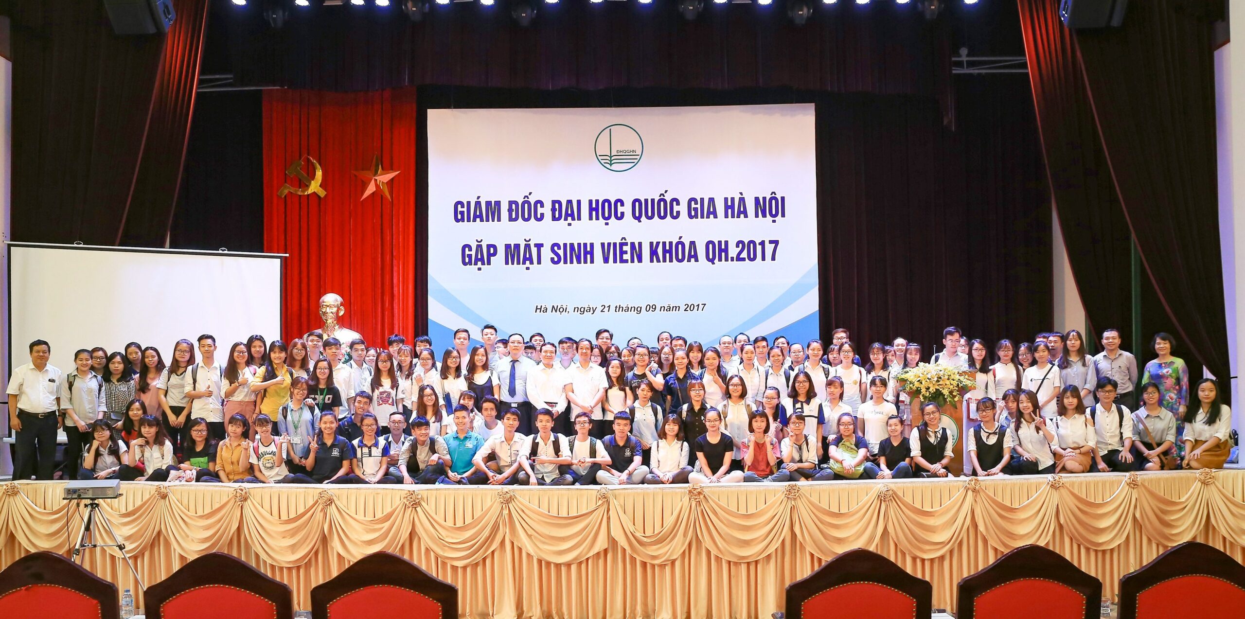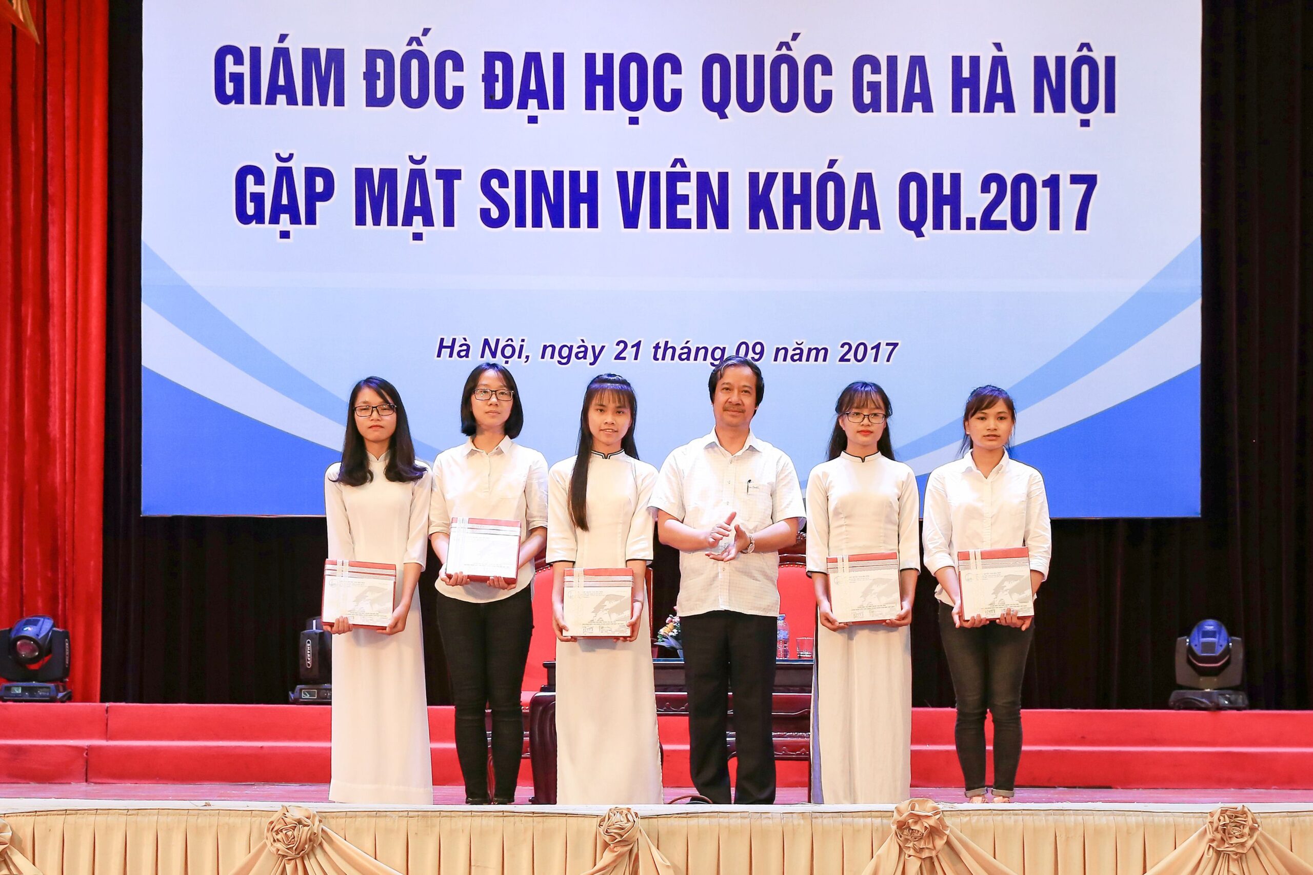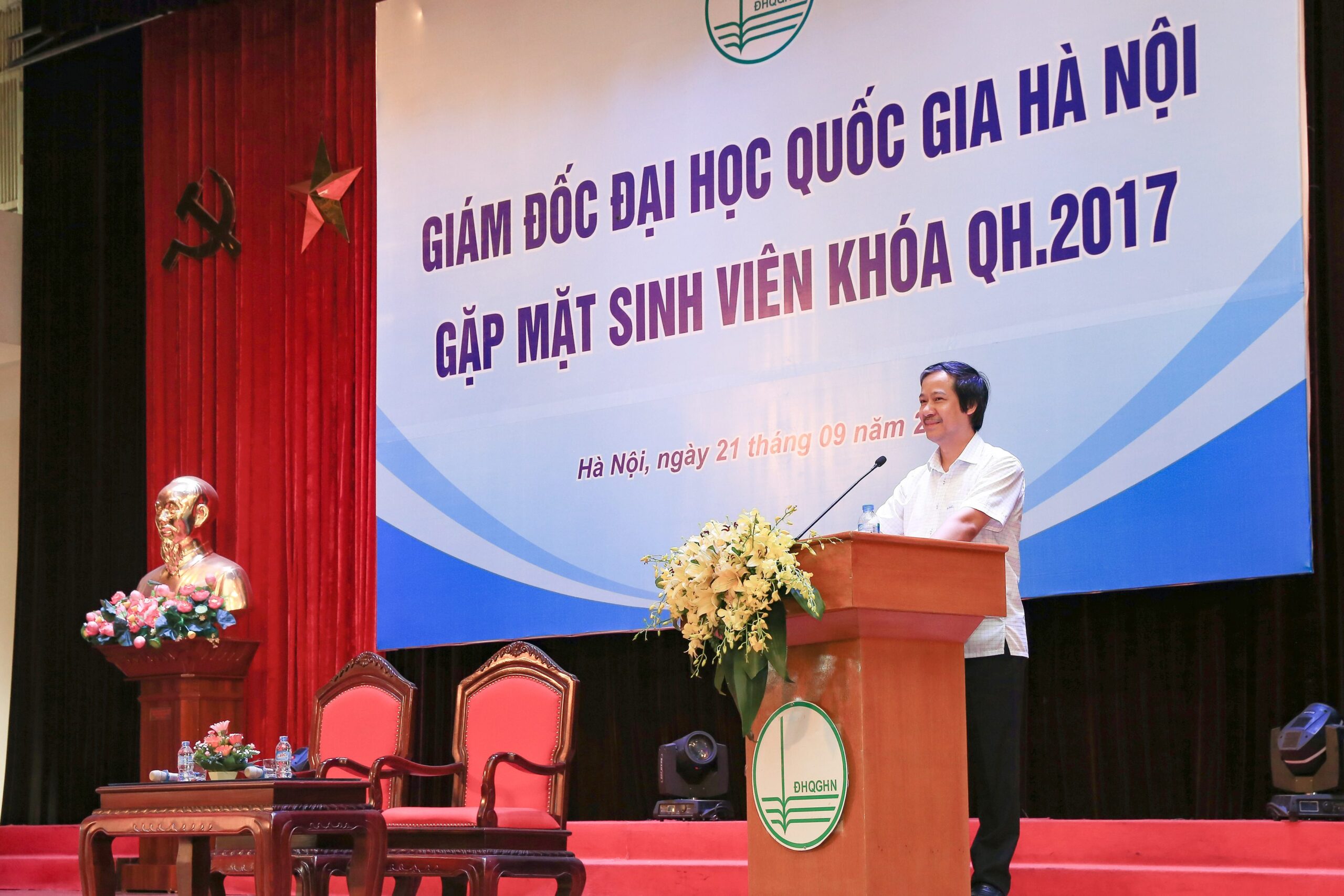 Sáng ngày 21/09/2017, Giám đốc ĐHQGHN Nguyễn Kim Sơn đã có buổi gặp mặt và trao đổi với hơn 400 tân sinh viên đại diện cho các sinh viên khóa QH – 2017. Tại buổi nói chuyện, Giám đốc đã có những chia sẻ về tinh thần đại học nói chung, ĐHQGHN nói riêng và những yêu cầu của cuộc sống đối với sinh viên thế kỷ XXI. Đồng thời, tân thủ khoa Nguyễn Thị Huệ (Khoa Công nghệ thông tin, Trường Đại học Công nghệ) với số điểm 29,75 là một trong năm thủ khoa được Giám đốc trao thưởng vì đạt thành tích cao tại kỳ thi tuyển sinh vào ĐHQGHN năm 2017.