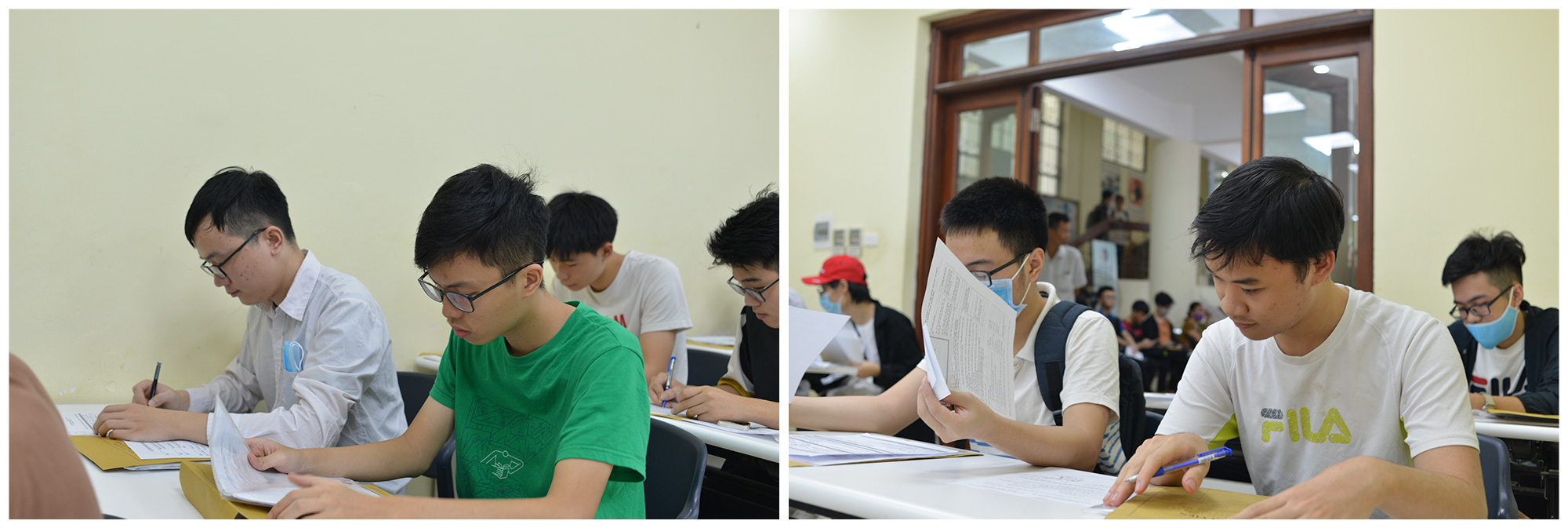 Tân sinh viên Vũ Hoàng Kiên (đạt Huy chương Bạc tại Olympic Tin học quốc tế 2019, 2020) và Nguyễn Quang Thành (đạt Huy chương Đồng tại Olympic tin học quốc tế 2020) làm thủ tục nhập học tại khu vực thẩm định hồ sơ