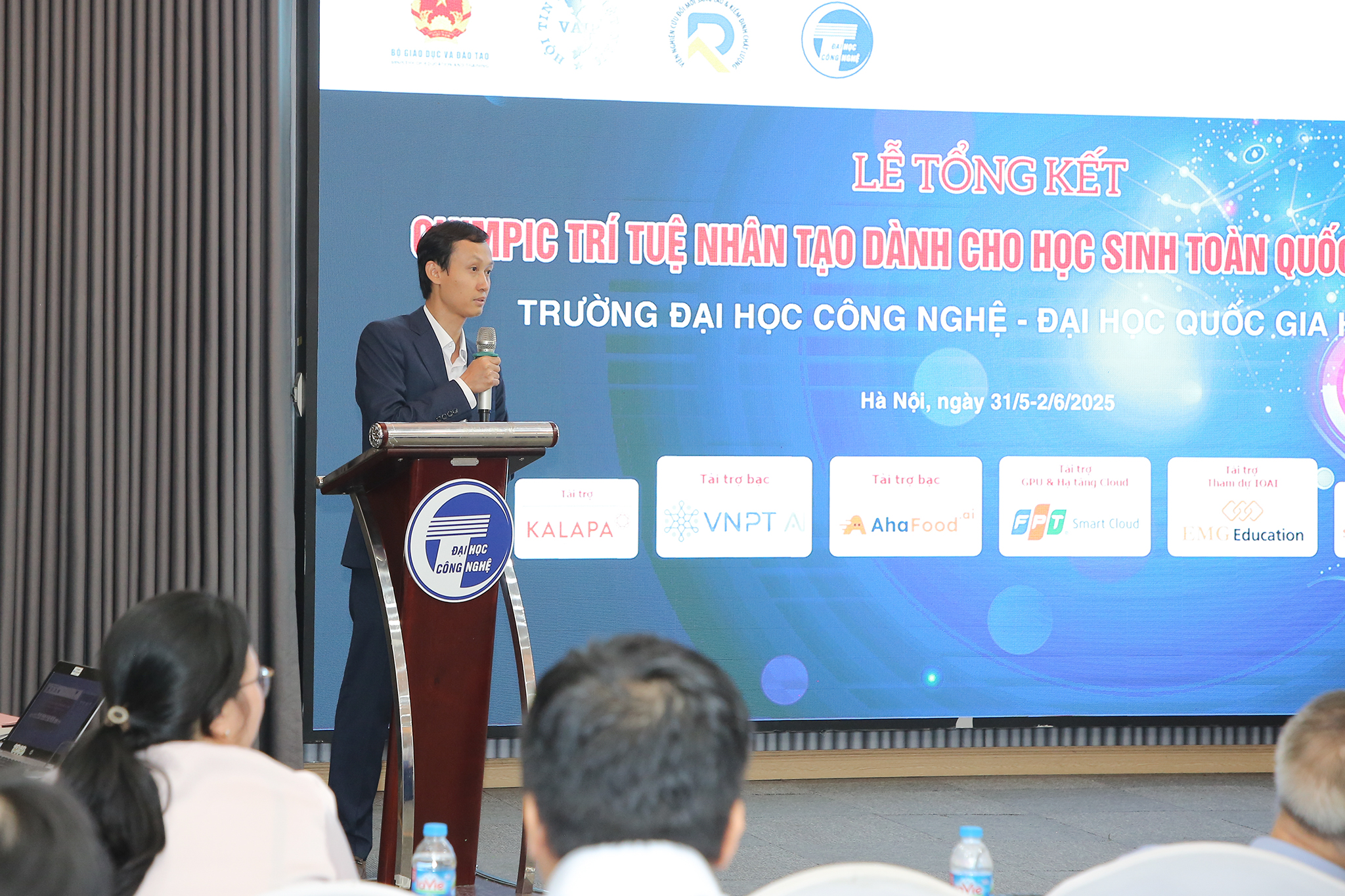 Phát biểu tại lễ bế mạc Chung kết Olympic Trí tuệ nhân tạo Việt Nam 2025, GS.TS Chử Đức Trình – Hiệu trưởng Trường ĐH Công nghệ, đồng Trưởng Ban tổ chức đã gửi lời cảm ơn tới các thầy cô, học sinh đến từ 17 tỉnh, thành phố và 4 trường THPT chuyên đã góp phần làm nên một kỳ thi ý nghĩa và chất lượng, đồng thời tin tưởng các em sẽ tiếp tục gặt hái nhiều thành công trên hành trình sắp tới. Khẳng định vai trò then chốt của AI, GS. Chử Đức Trình nhấn mạnh, mỗi cá nhân nói chung và những thí sinh tại kỳ thi nói riêng đều là yếu tố quan trọng góp phần phát triển các sản phẩm công nghệ thông tin – truyền thông và AI trong tương lai.