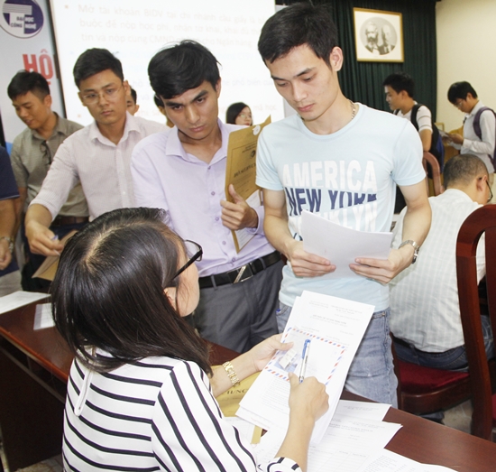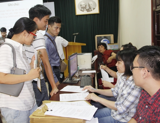 Các học viên và nghiên cứu sinh được các bộ Nhà trường hướng dẫn làm thủ tục nhập học