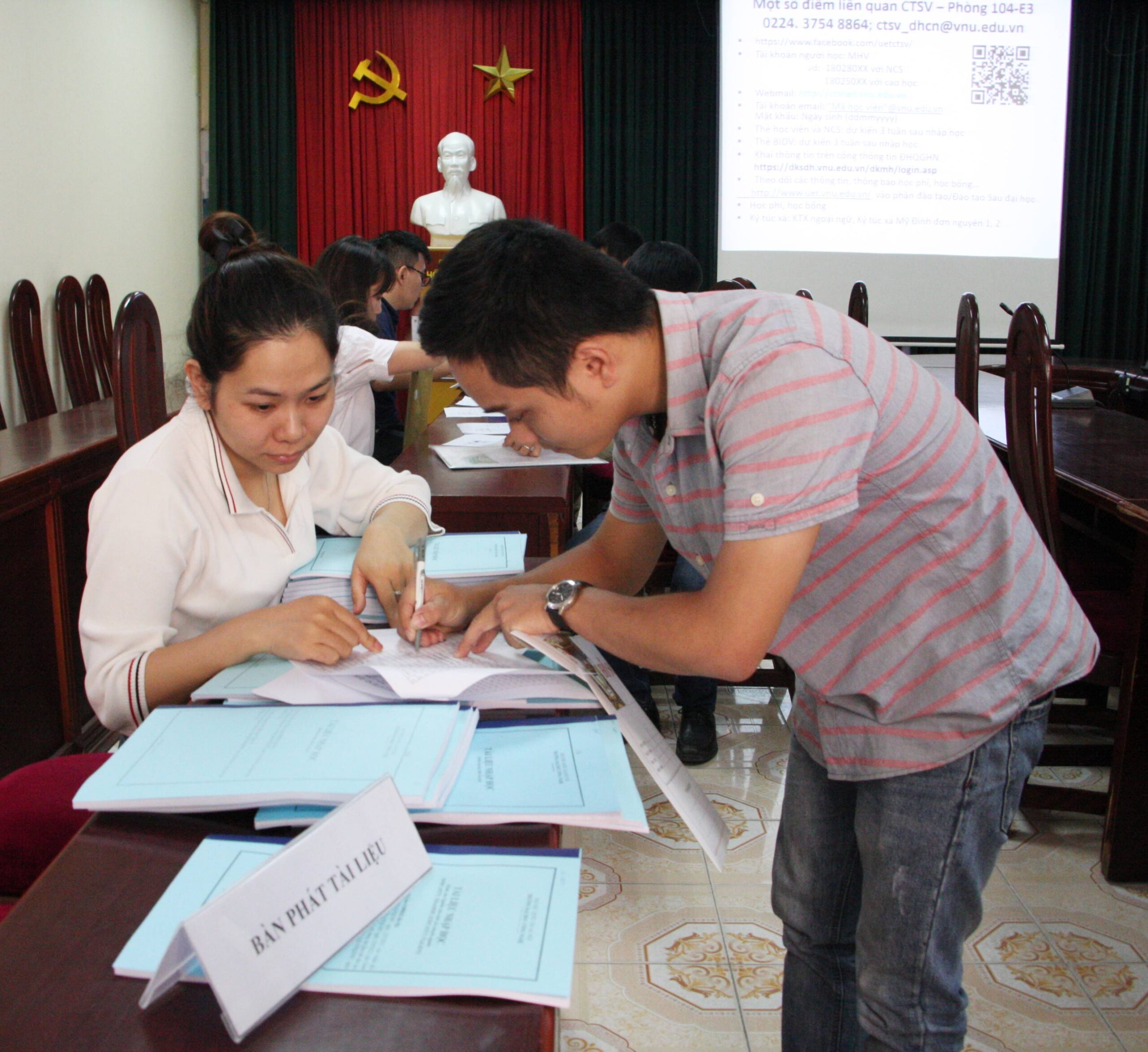 Các học viên và nghiên cứu sinh được các bộ Nhà trường hướng dẫn làm thủ tục nhập học