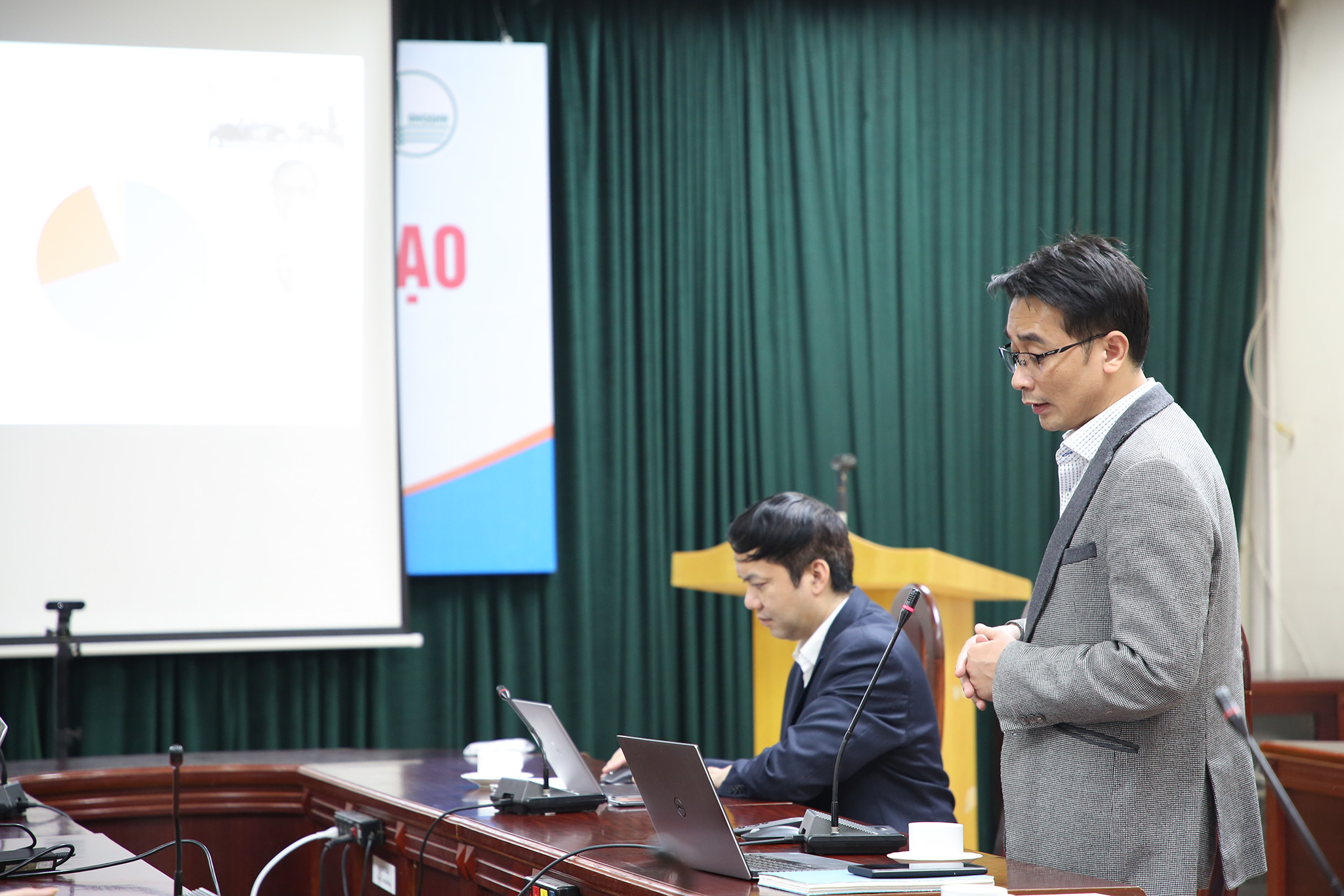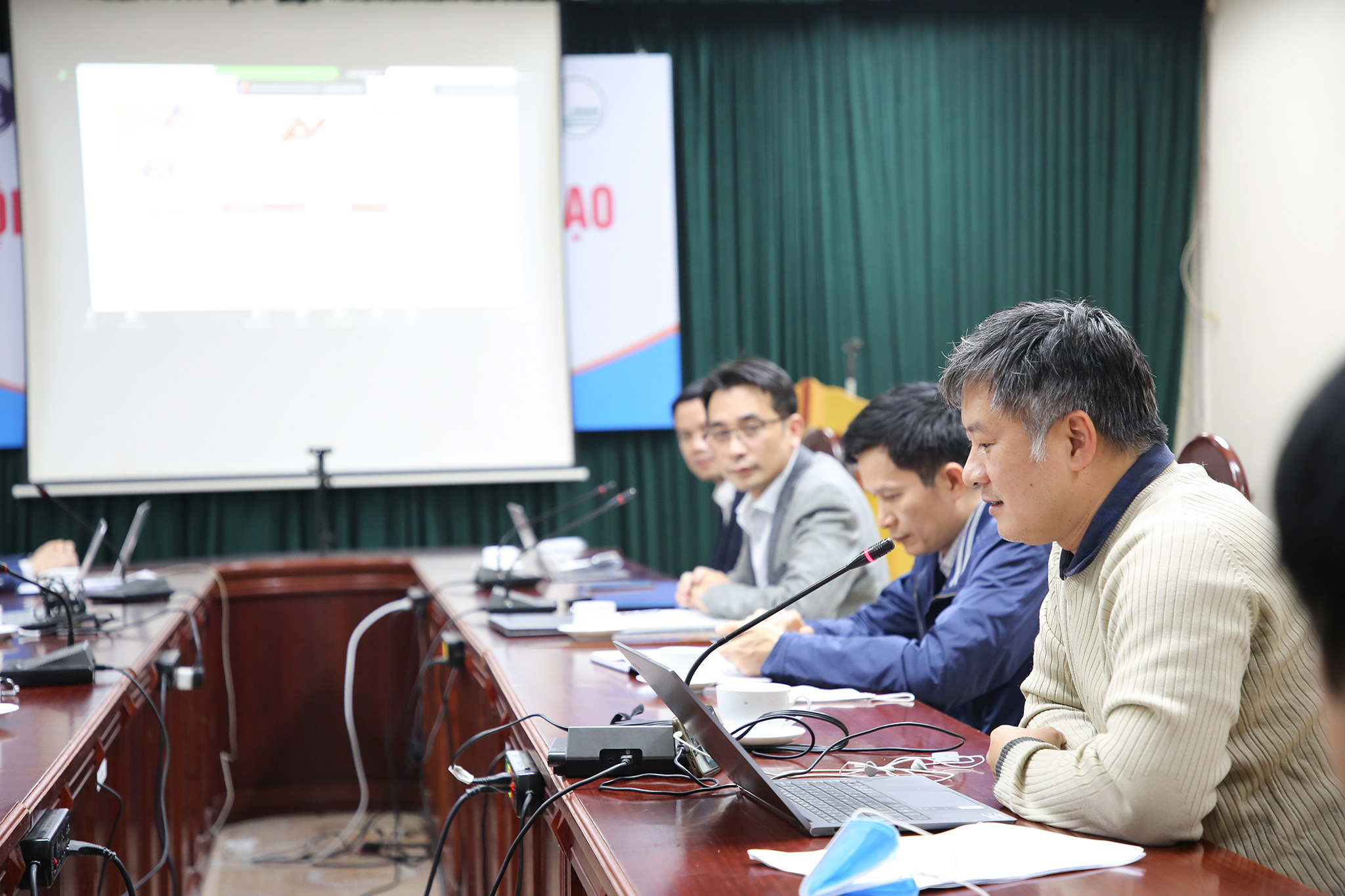 Sau báo cáo kết quả công tác đào tạo, nghiên cứu khoa họ, GS.TS Chử Đức Trình tiếp tục báo cáo Đề án thành lập Viện Trí tuệ nhân tạo. Tiếp theo, các thành viên trong Hội đồng lắng nghe PGS.TS. Nguyễn Linh Trung – Viện trưởng Viện Tiên tiến về kỹ thuật và công nghệ báo cáo Đề án thành lập Phòng thí nghiệm Kết nối trí tuệ số.