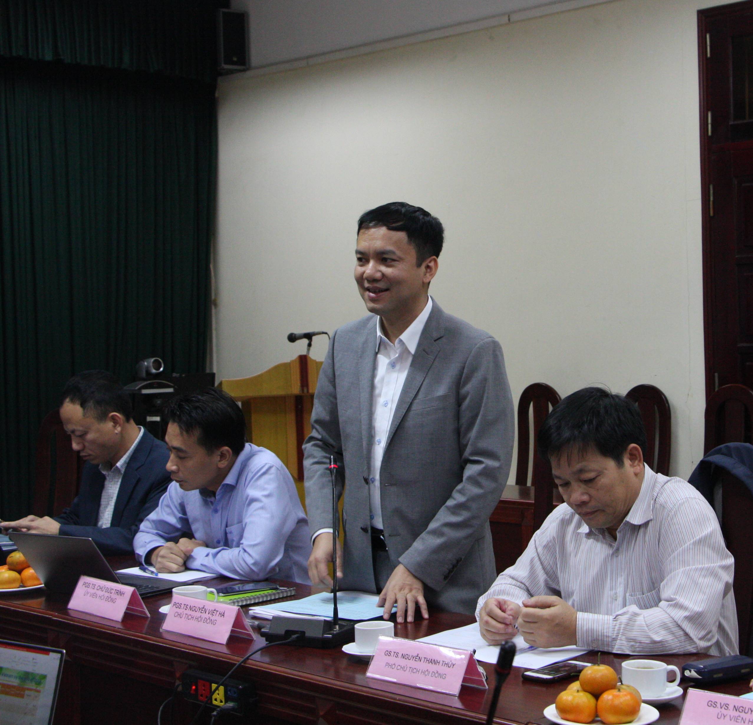 PGS.TS.Trần Xuân Tú và PGS.TS. Nguyễn Phương Thái trình bày báo cáo công tác khoa học công nghệ và công tác đào tạo
